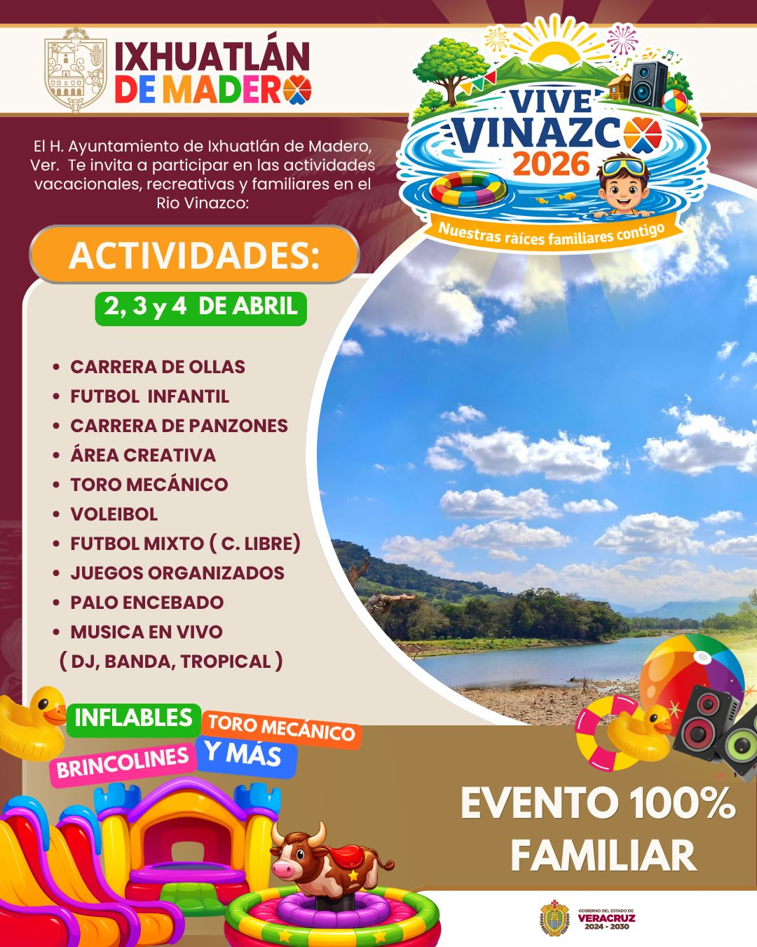 Ixhuatlán de Madero, Ver.- El Honorable Ayuntamiento de Ixhuatlán de Madero que preside Héctor Norberto “Toto” Aguirre Ibarrola, invita a toda la ciudadanía y visitantes a disfrutar de unos días llenos de alegría, convivencia y tradición en el río Vinazco este 2, 3 y 4 de abril.