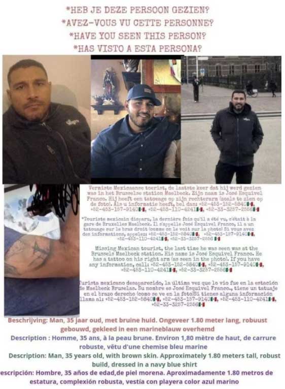 Ciudad de México.- Otro caso de un mexicano desaparecido en el extranjero: José Esquivel Franco, de 35 años de edad, desapareció en Bruselas, Bélgica, desde el 12 de julio.