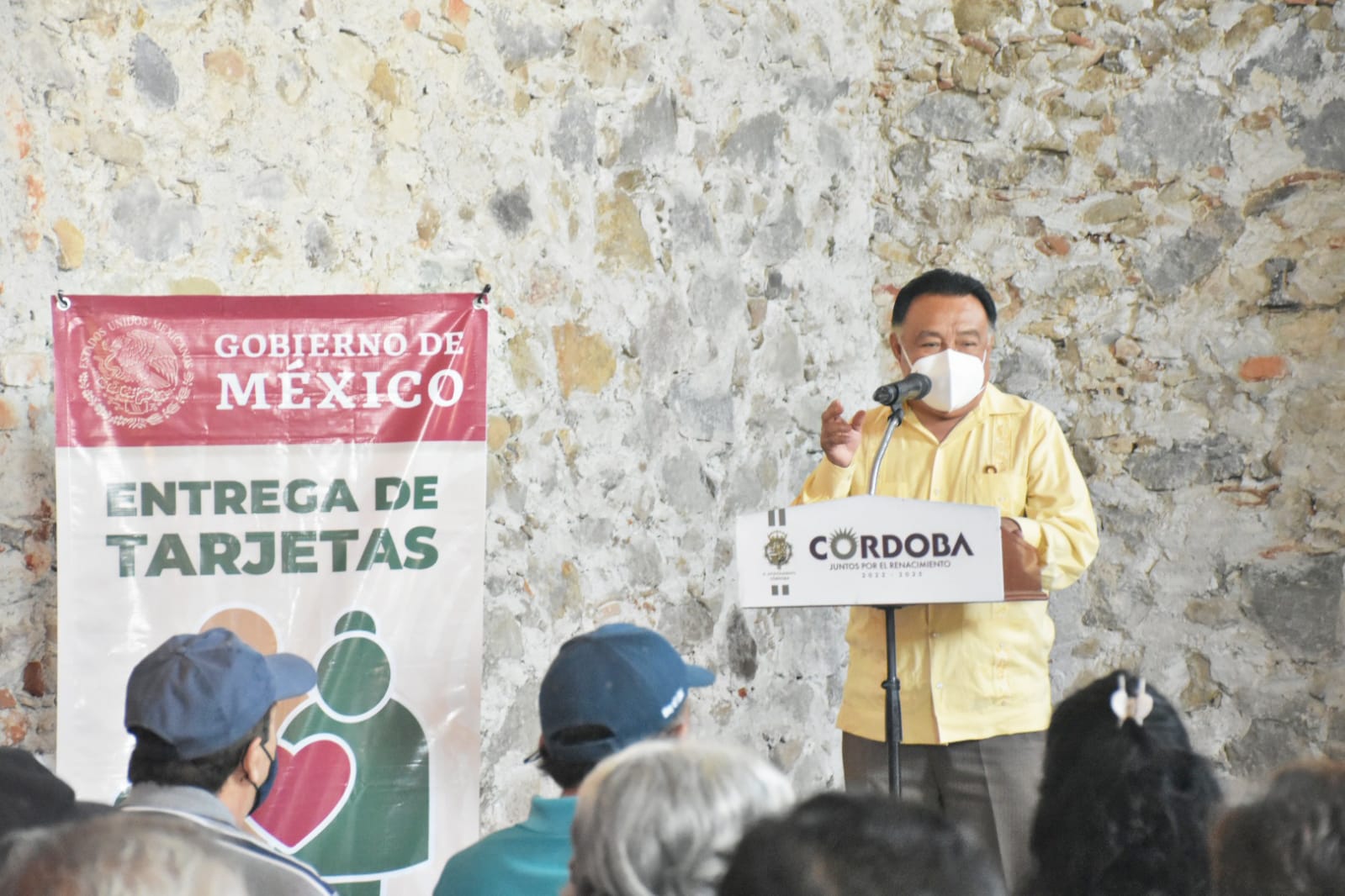 Córdoba, Ver.- El alcalde de Córdoba, Juan Martínez Flores, acompañó este día al delegado de Programas para el Desarrollo en el estado, Manuel Huerta Ladrón de Guevara, a la entrega de 800 tarjetas a cordobesas y cordobeses, derivado del programa “Pensión para el Bienestar de las Personas Adultas Mayores” que se llevó a cabo en las instalaciones de la Ex Hacienda San Francisco Toxpan.