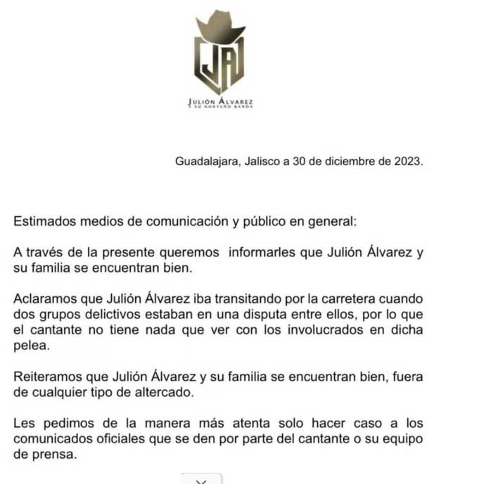 “A través de la presente queremos informarles que Julión Álvarez y su familia se encuentran bien. Aclaramos que Julión Álvarez iba transitando por la carretera cuando dos grupos delictivos estaban en una disputa entre ellos, por lo que el cantante no tiene nada que ver con los involucrados en dicha pelea”.