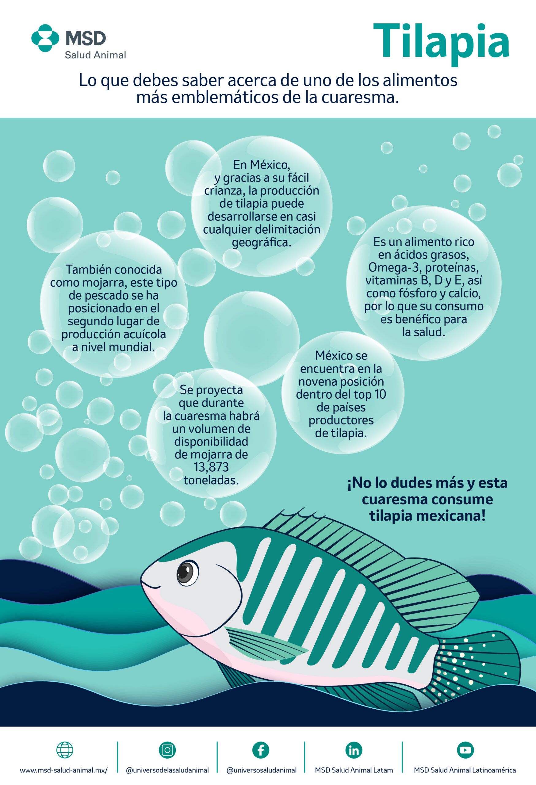 "Para asegurar su producción no sólo debe tenerse la infraestructura necesaria, sino que debe vigilarse el cumplimiento de los estándares de inocuidad alimentaria, así como velar por la salud de la tilapia en todo momento a través de la atención médica en cada una de las etapas de producción, pues al final del ciclo éstas se convertirán en una fuente alimenticia llena de nutrientes", señaló Alim Castillo de MSD Salud Animal en México.