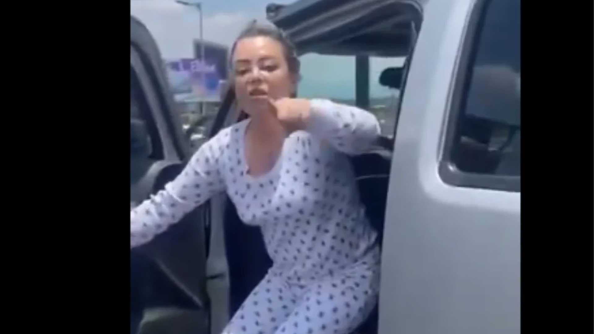 En otra de las tomas, se observa a la mujer que golpeó al auto cuando se baja de la camioneta y se para en los carriles centrales para hacer señas mientras los autos pasan a alta velocidad.