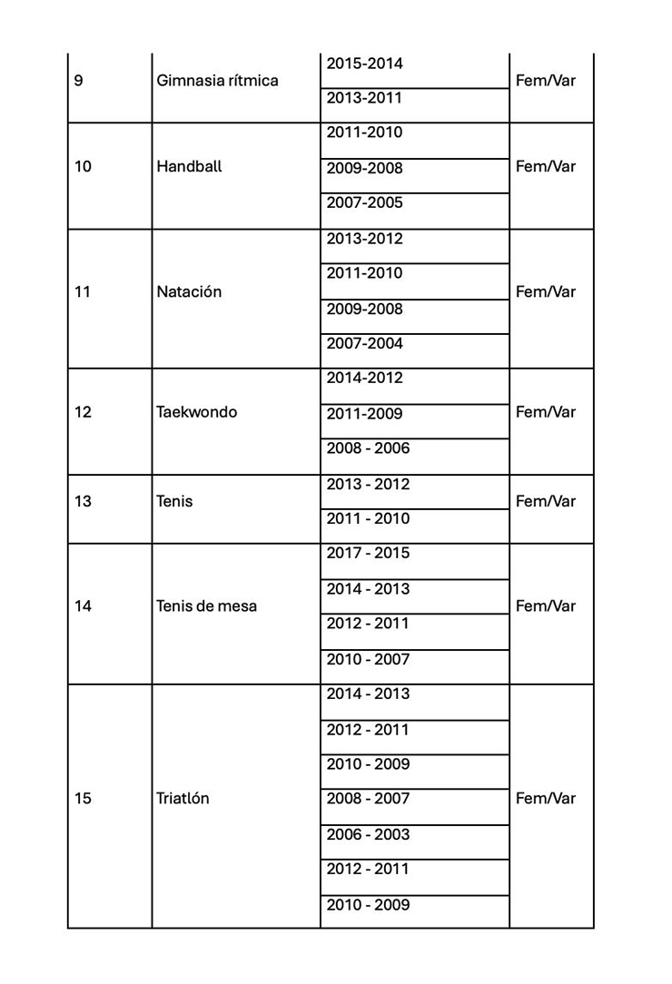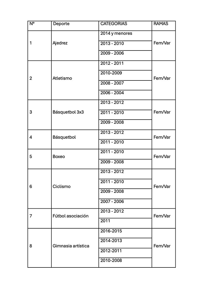 A continuación, las disciplinas deportivas, así como las categorías y ramas de cada una de los deportes: