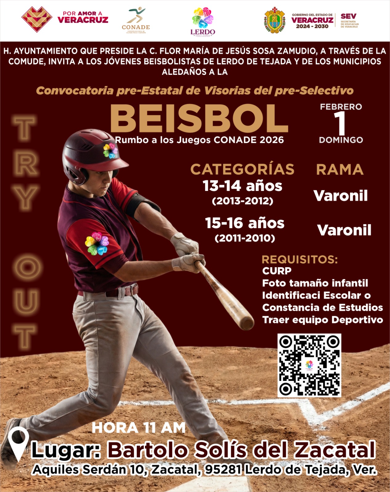 Lerdo, Ver.- El Gobierno Municipal de Lerdo de Tejada encabezado por la alcaldesa Flor María Sosa Zamudio, informa que ya se encuentra abierta la Convocatoria de Try-Outs de Béisbol, emitida por la Asociación de Béisbol de la Entidad Veracruzana A.C., en coordinación con el Instituto Veracruzano del Deporte, rumbo a la Olimpiada Nacional Conade 2026.