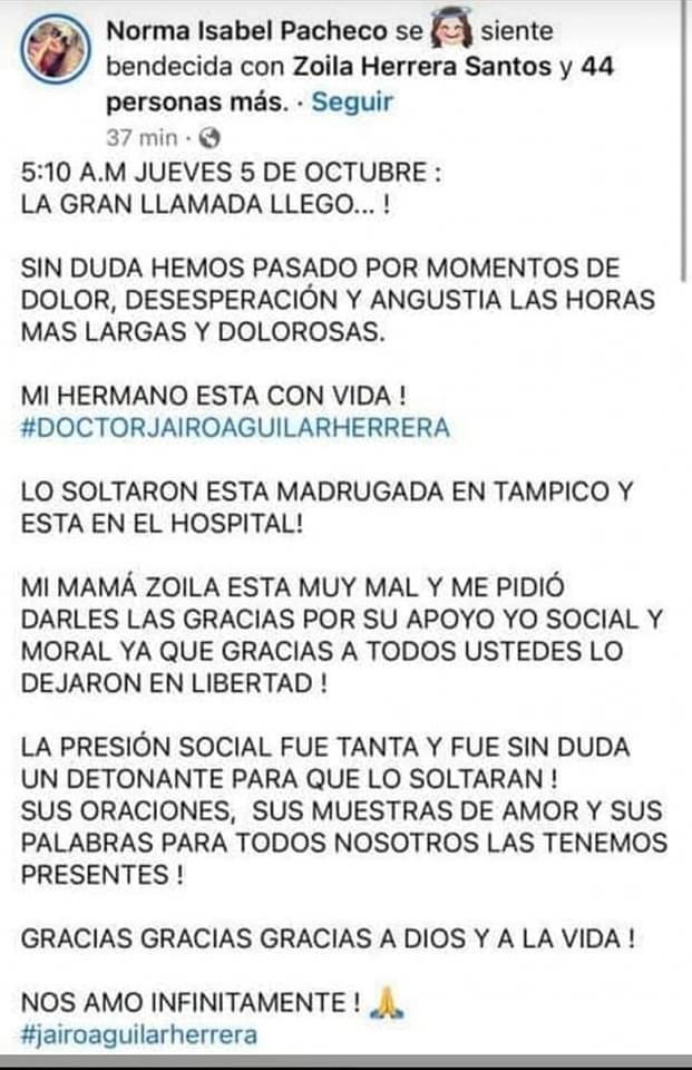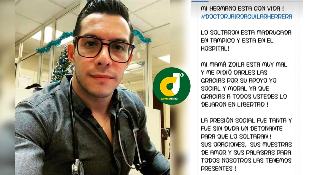 En sus redes sociales la familia del doctor informó que había sido liberado y que estaba en el hospital; señaló que la presión social y las oraciones permitieron que el joven médico fuera liberado.