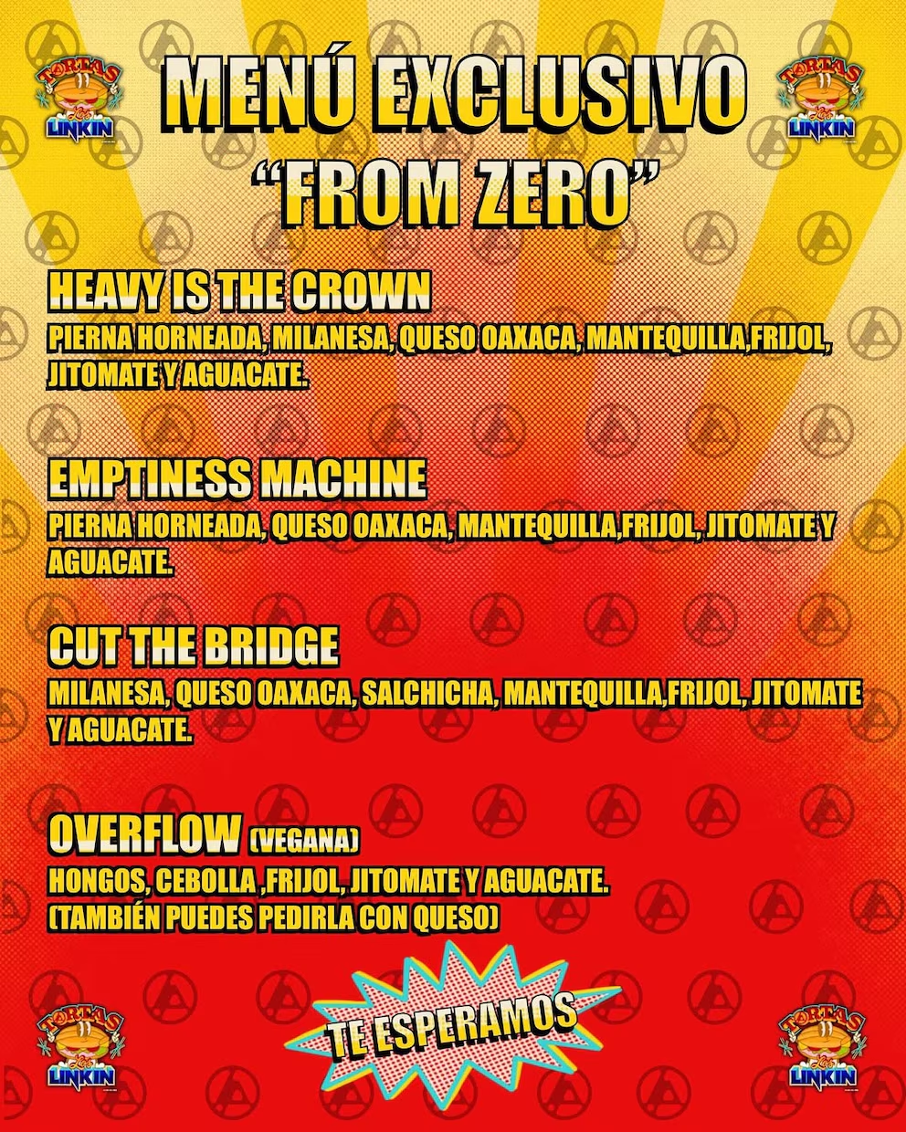 El menú especial, denominado From Zero, destaca por su creatividad y por los guiños directos a la discografía de la banda. Cada torta lleva un nombre inspirado en canciones icónicas de Linkin Park, lo que añade un elemento temático a la oferta gastronómica. Esta propuesta refuerza la conexión entre la identidad musical del grupo y la cultura culinaria local, invitando a los asistentes a descubrir referencias en cada platillo.