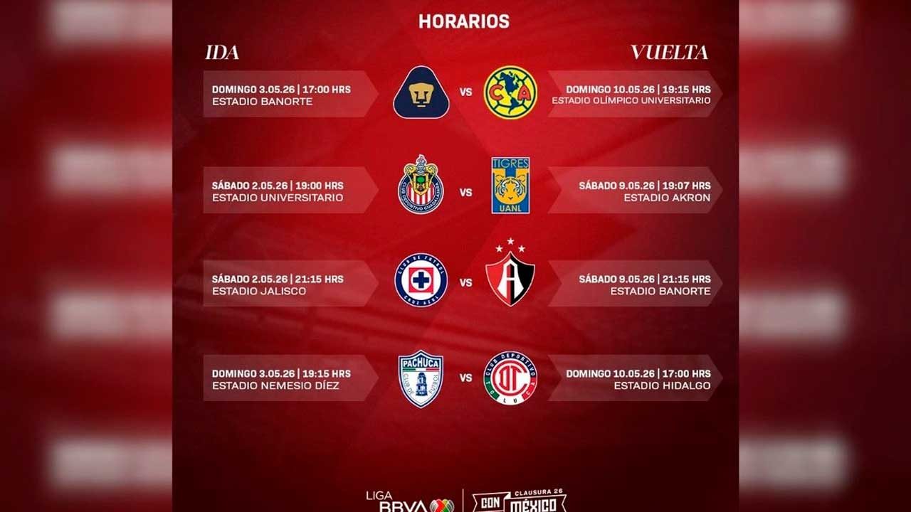 Ciudad de México.- Tras concluir la fase regular, la Liga Mx confirmó las fechas y horarios de los cuartos de final del Clausura 2026, torneo que antecede la celebración de la tercera Copa Mundial de la FIFA en México desde 1970.