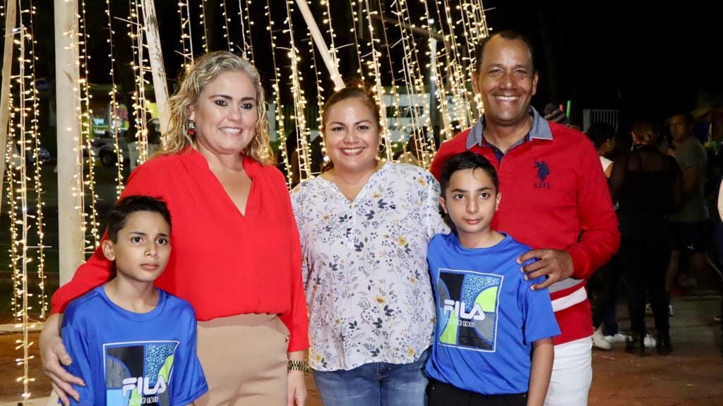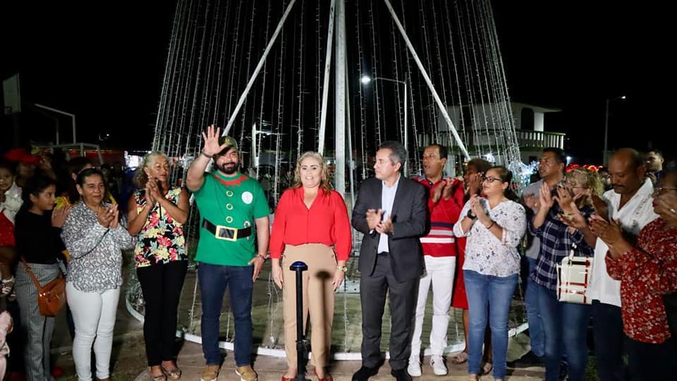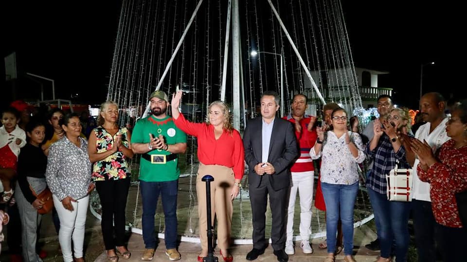 Alvarado, Ver.- Rodeada de familias de la congregación de Antón Lizardo y localidades vecinas la alcaldesa de Alvarado, Lizzette Álvarez Vera; síndico único, Jaime Abel Tiburcio Herrera; regidor Pedro Gamboa y directores de área, encendieron el árbol navideño.