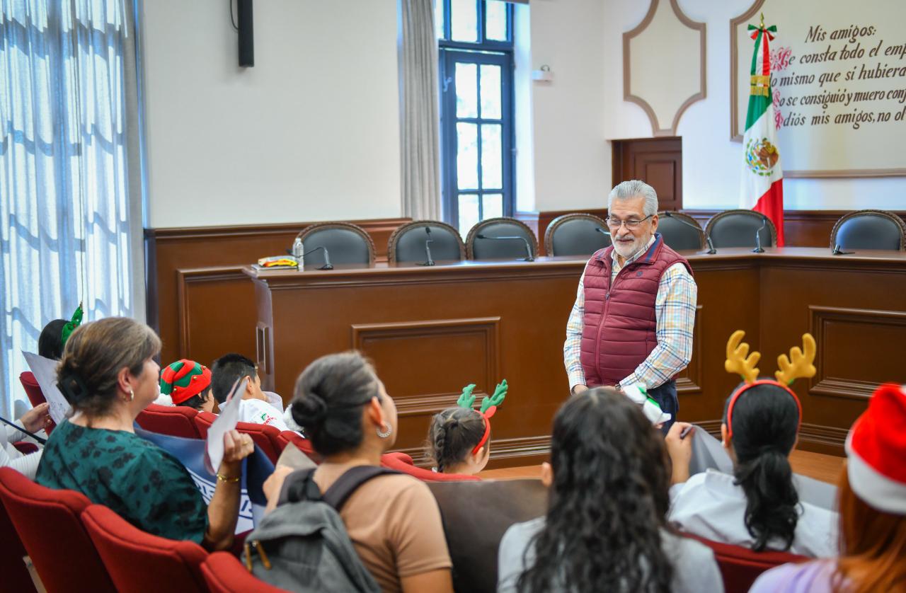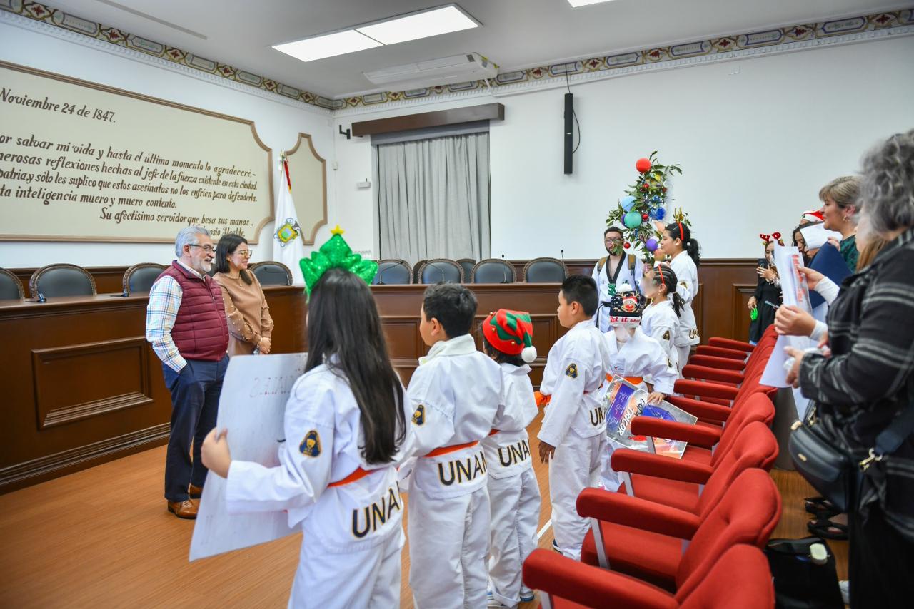 Xalapa, Ver.- Como parte de las acciones de fomento a las tradiciones, el alcalde Alberto Islas Reyes recibió en la Sala de Cabildo a integrantes del Club de Taekwondo Pumas Myeong Xalapa, quienes le cantaron La Rama.