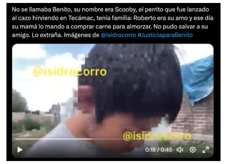 No se llamaba Benito, su nombre era Scooby, el perrito que fue lanzado al cazo hirviendo en Tecámac, tenía familia: Roberto era su amo y ese día su mamá lo mando a comprar carne para almorzar. No pudo salvar a su amigo. Lo extraña. Imágenes de @isidrocorro #JusticiaparaBenito pic.twitter.com/tQM2WEsuj9