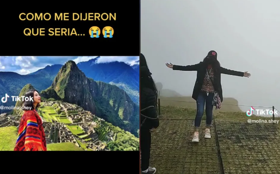En el video, Shey mostró una foto promocional que ofrecía una vista espectacular de Machu Picchu, pero la densa neblina que cubría el lugar opacó completamente la vista en el momento de su visita.
