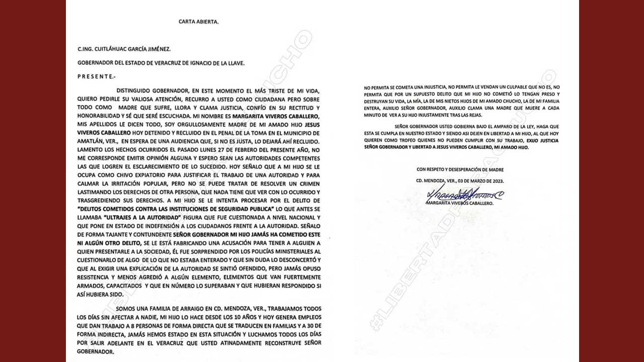 En mensaje en video en sus redes sociales y carta enviada al gobernador de Veracruz, Cuitláhuac García Jiménez, la mujer de la tercera edad pide que se respete la ley, pues su hijo no cometió el delito que le imputan y que es similar a los que “antes se llamaba ultrajes a la autoridad”.