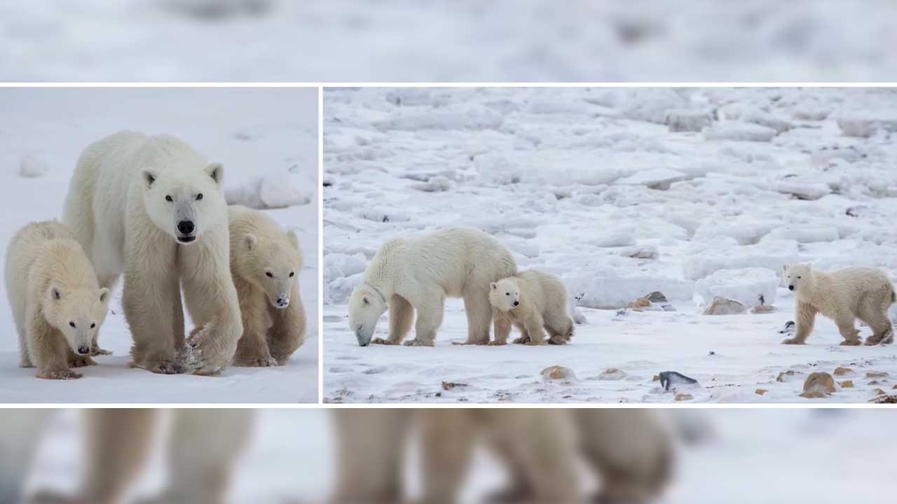 El material de video recopilado muestra a las crías observando un paisaje cubierto de nieve, con la madre caminando de un lado a otro detrás de ellas, y una secuencia en la que uno de los oseznos se apresura a reunirse con los otros.