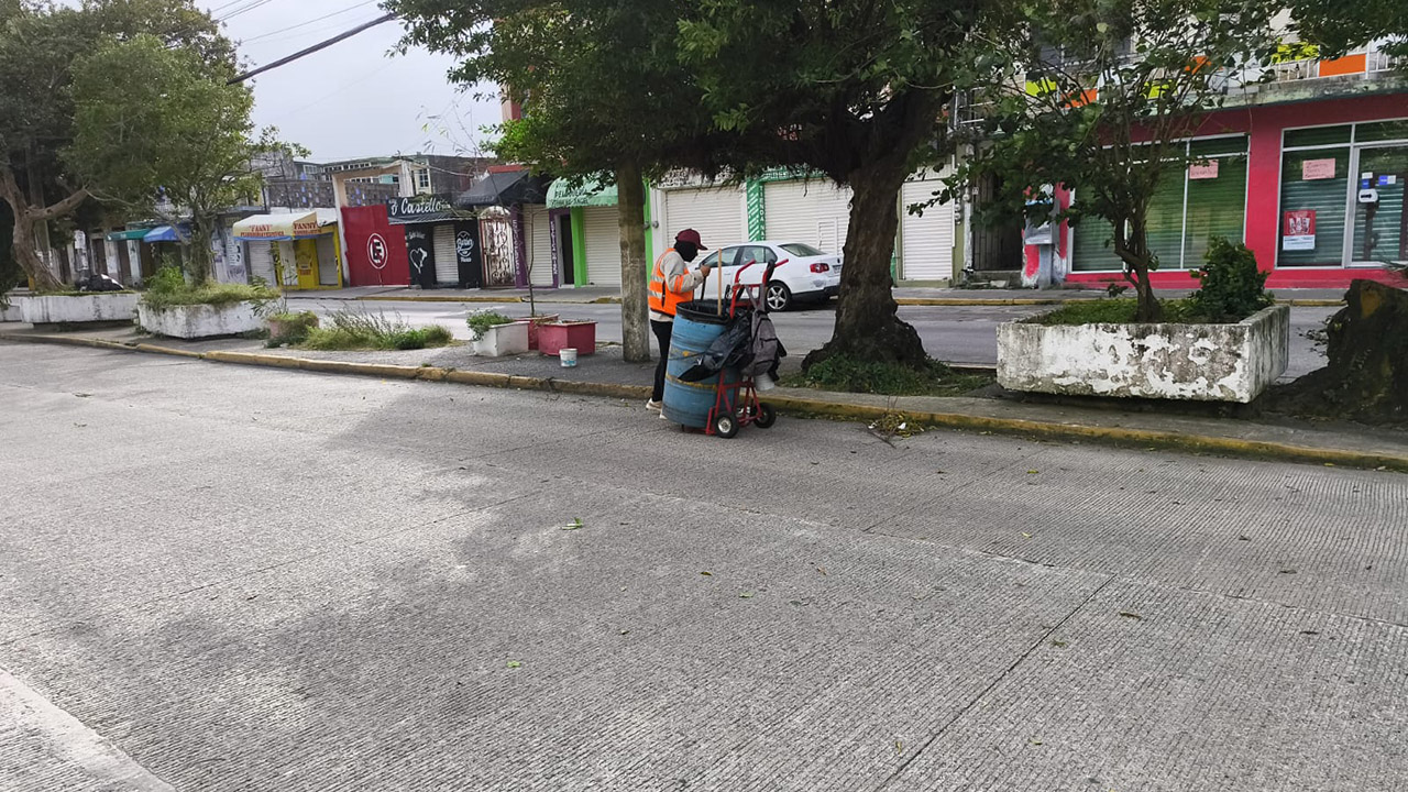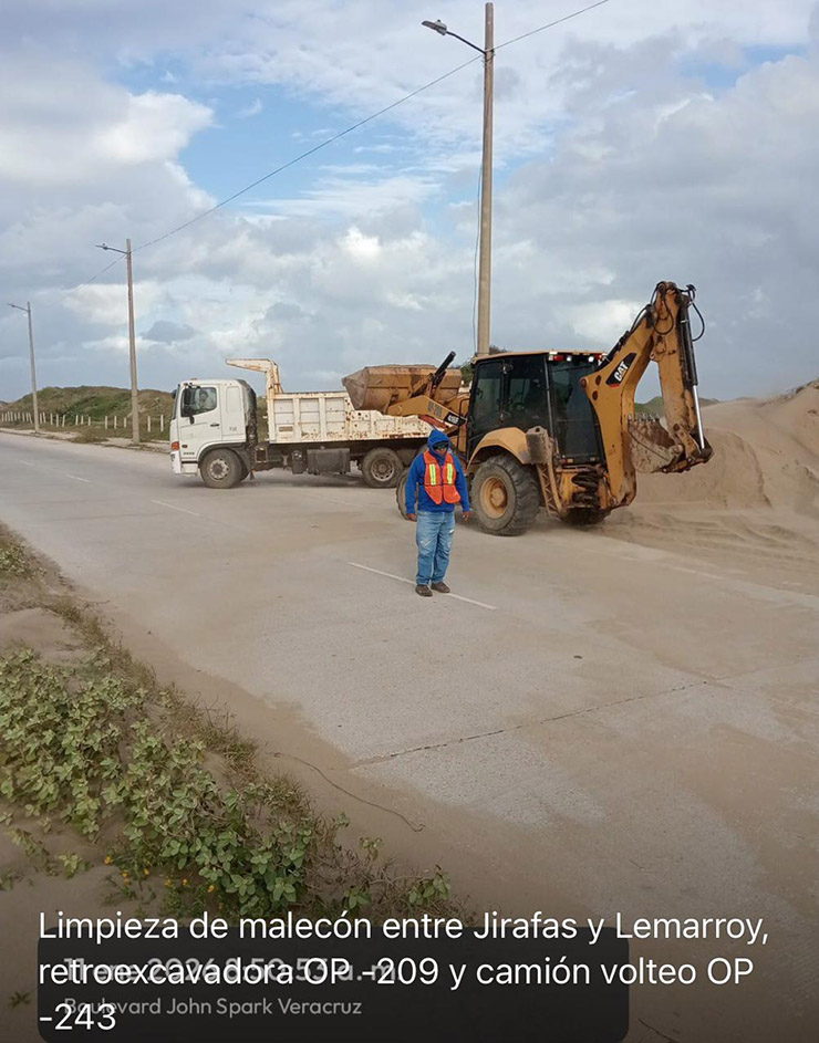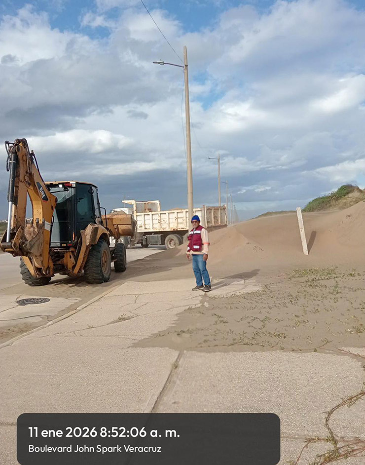 Servidores de Obras Públicas realizan labores de retiro de arena en el Malecón para mejorar el tránsito vehicular, mientras que Limpia Pública lleva a cabo acciones de limpieza en el Centro de la ciudad para evitar obstrucciones en drenajes y posibles inundaciones.