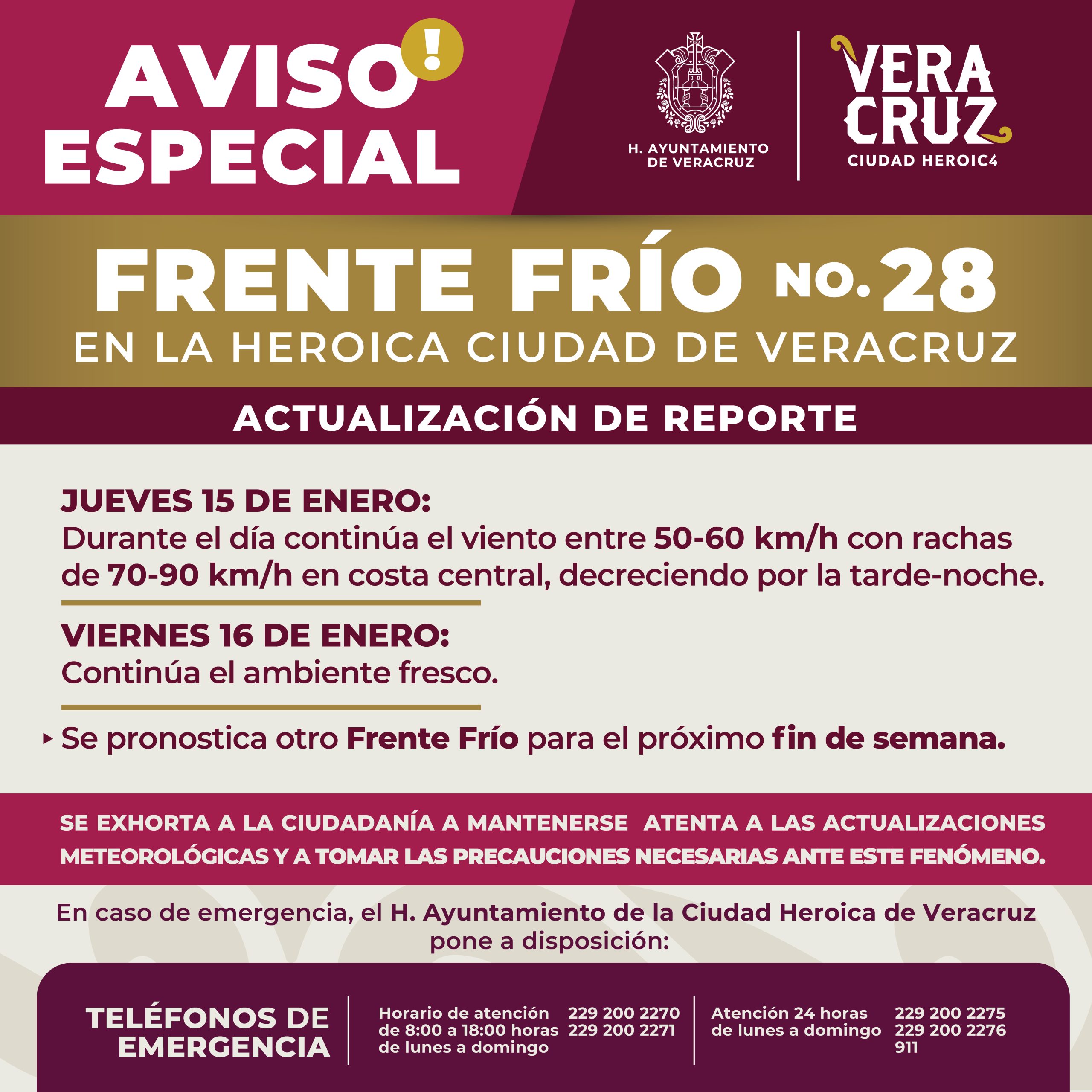Veracruz, Ver.- La dirección de Protección Civil municipal informó que continúa el Aviso Especial por el paso del Frente Frío número 28 en la ciudad de Veracruz, prevaleciendo el viento del norte de 50 a 60 km/h, y por la tarde noche de este jueves alcanzará rachas de 70 a 90 km/h, con oleaje de 1 a 3 metros en las proximidades de la costa.
