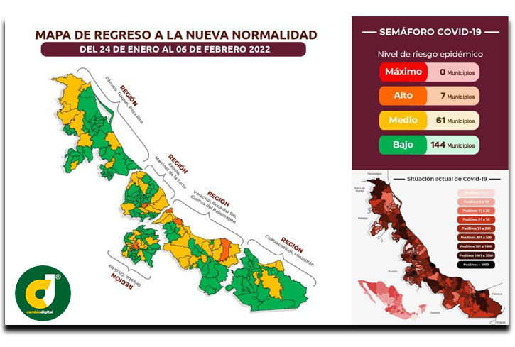 La Secretaría de Salud informó que del 24 de enero al 06 de febrero los municipios de Fortín, Ixtaczoquitlán, Xalapa, Orizaba, San Andrés Tuxtla, Úrsulo Galván y Veracruz tendrán semáforo naranja de riego alto.