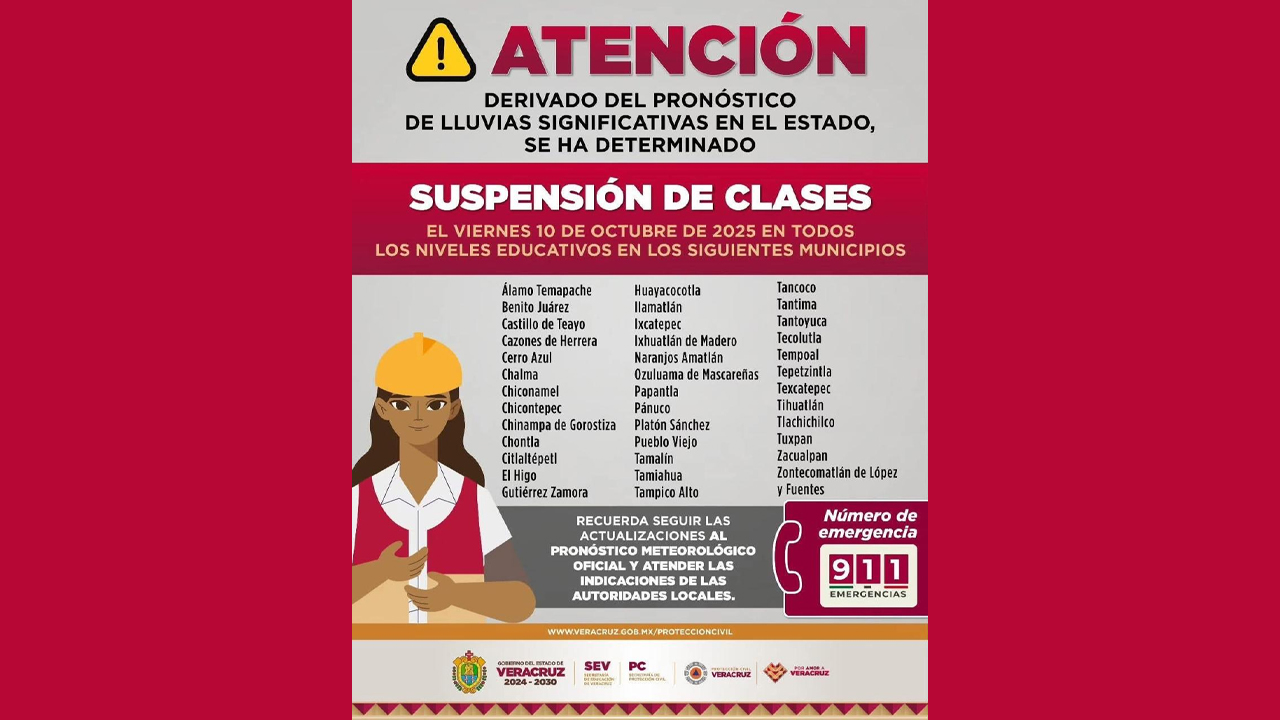 Ante el pronóstico de lluvias significativas y las afectaciones registradas en el norte de la entidad, se extiende la suspensión de clases para este viernes 10 de octubre de 2025 en todos los niveles educativos de los siguientes 38 municipios: