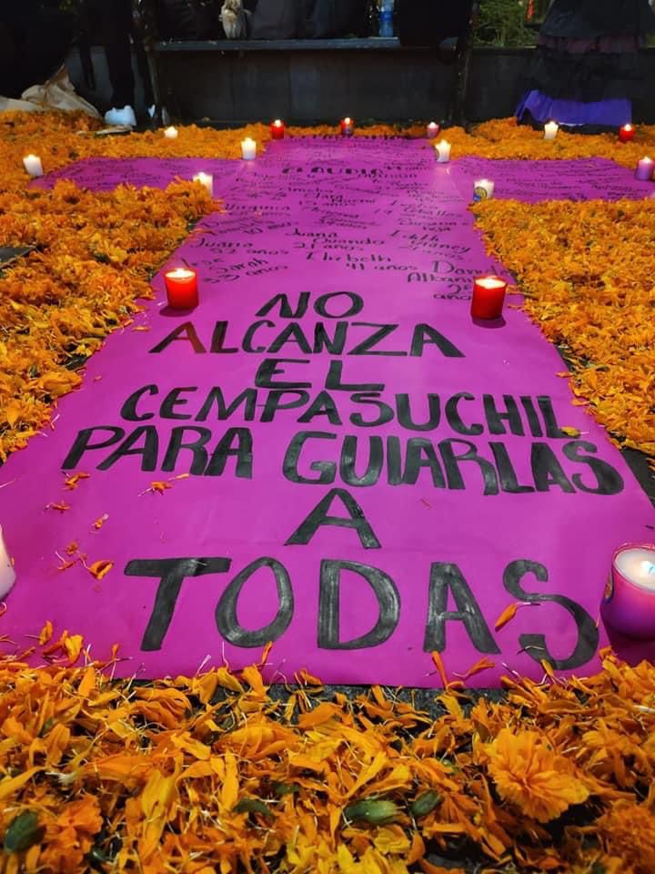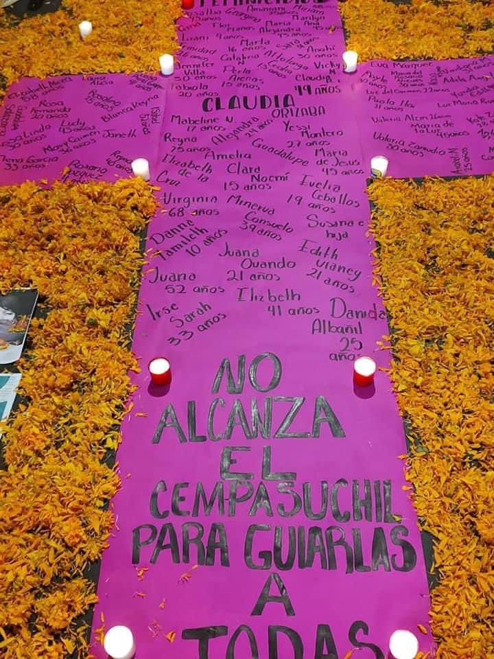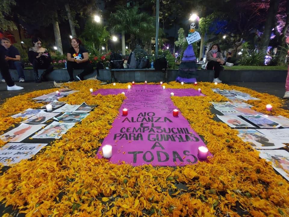 Una cruz rosa con veladoras y rodeada de flores de cempasúchil, los nombres de las mujeres asesinadas, fue colocada en el parque “Apolinar Castillo” del pueblo mágico de Orizaba.