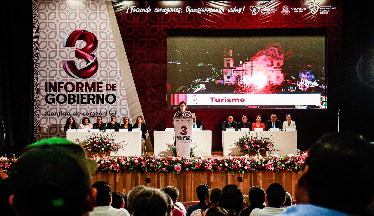 San Andrés Tuxtla, Ver.- Dando cumplimiento a lo que manda la fracción XXI del artículo 36 de la Ley Orgánica del Municipio Libre, este jueves 5 de diciembre, la Presidenta Municipal Constitucional de San Andrés Tuxtla, la doctora María Elena Solana Calzada, presentó su tercer informe de gobierno, teniendo como sede el Teatro de la Ciudad, donde se reunió la sociedad de San Andrés Tuxtla, para atestiguar este ejercicio de rendición de cuentas.