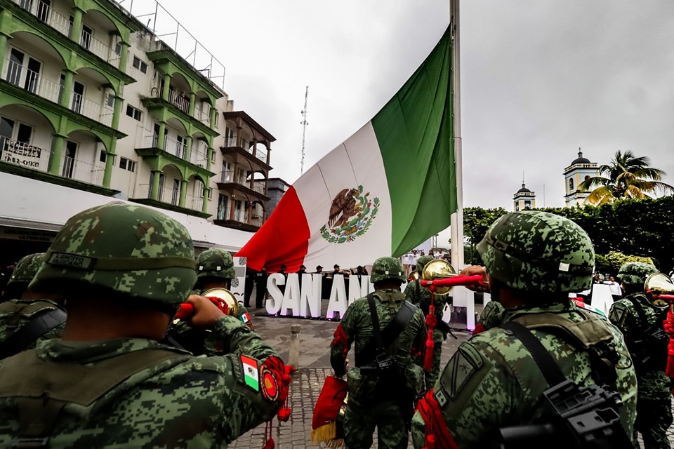 Tras el izamiento de bandera en la plaza cívica del Parque Sebastián Lerdo de Tejada, la banda de guerra del Primer Batallón de Infantería acompañó a las autoridades y personas reunidas ahí para entonar la letra de nuestro glorioso himno nacional.