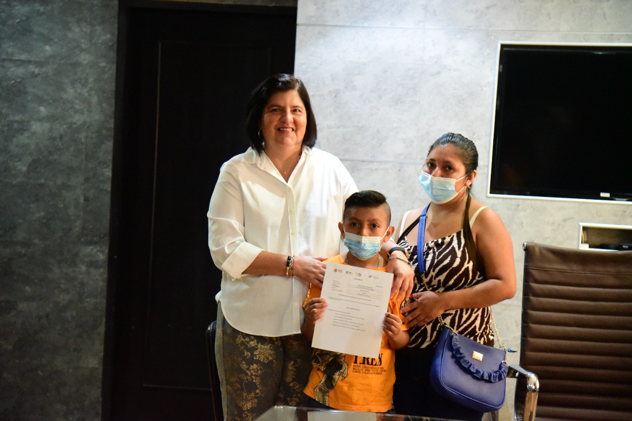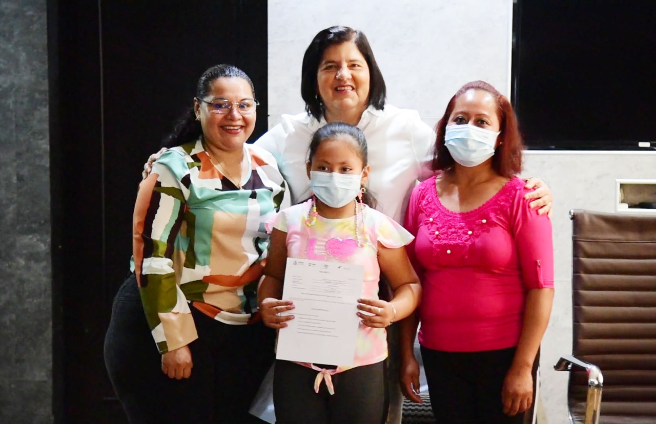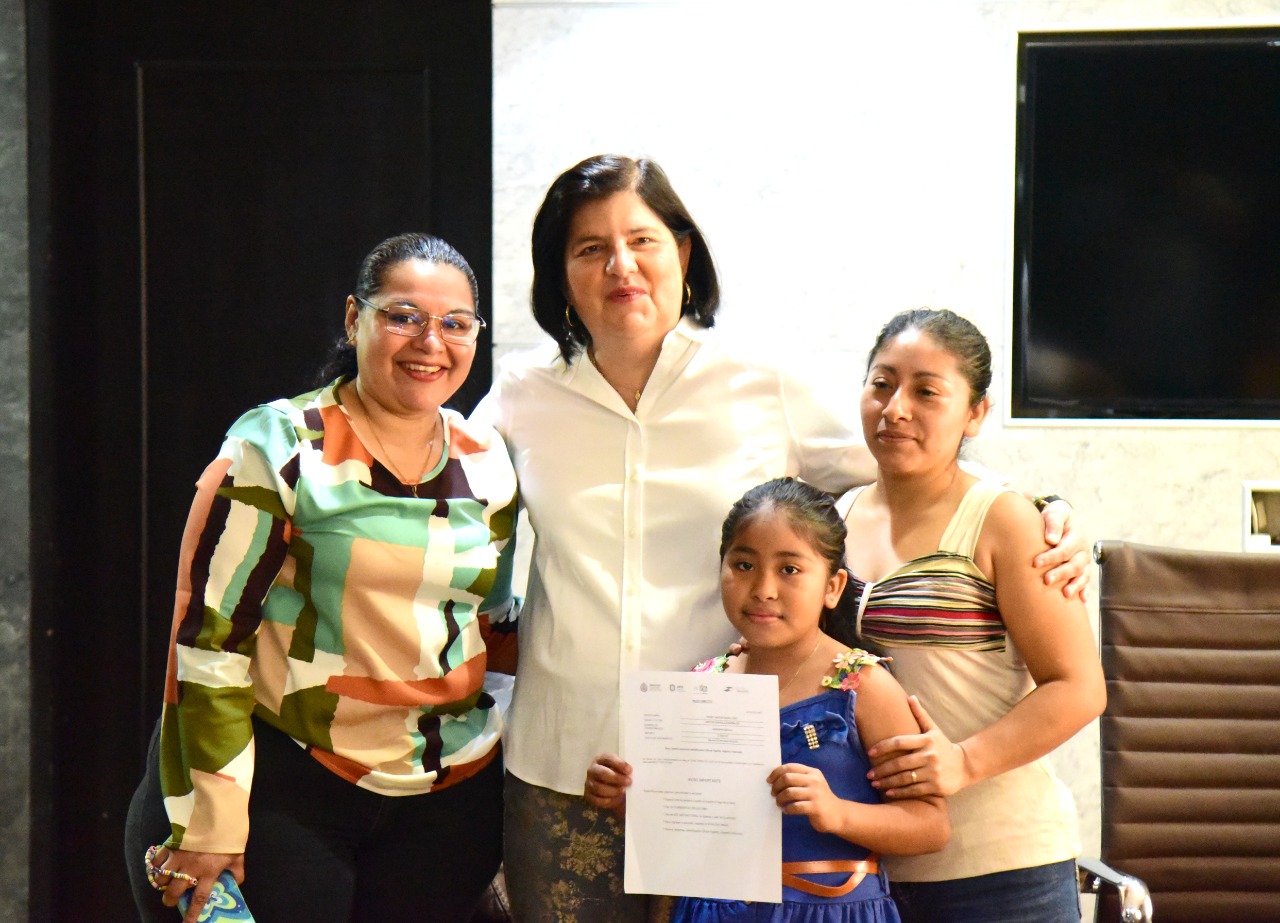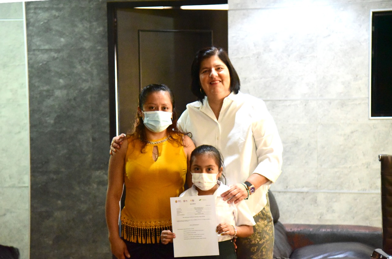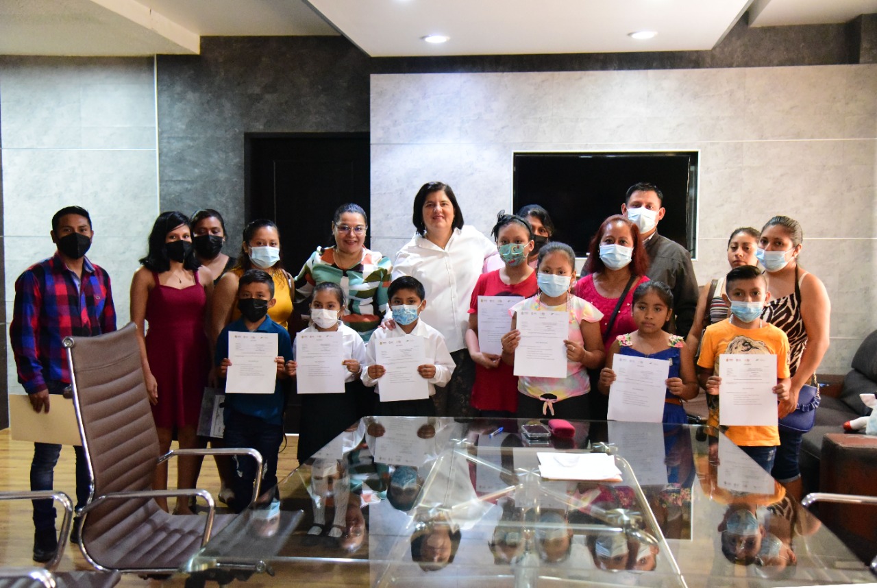 * La alcaldesa y la Directora Municipal de Desarrollo Social, Asunción Gómez Linares, hicieron entrega de becas a alumnos destacados de Ranchoapan, Cuesta de Laja, Texcaltitan y San Juan de la Gloria