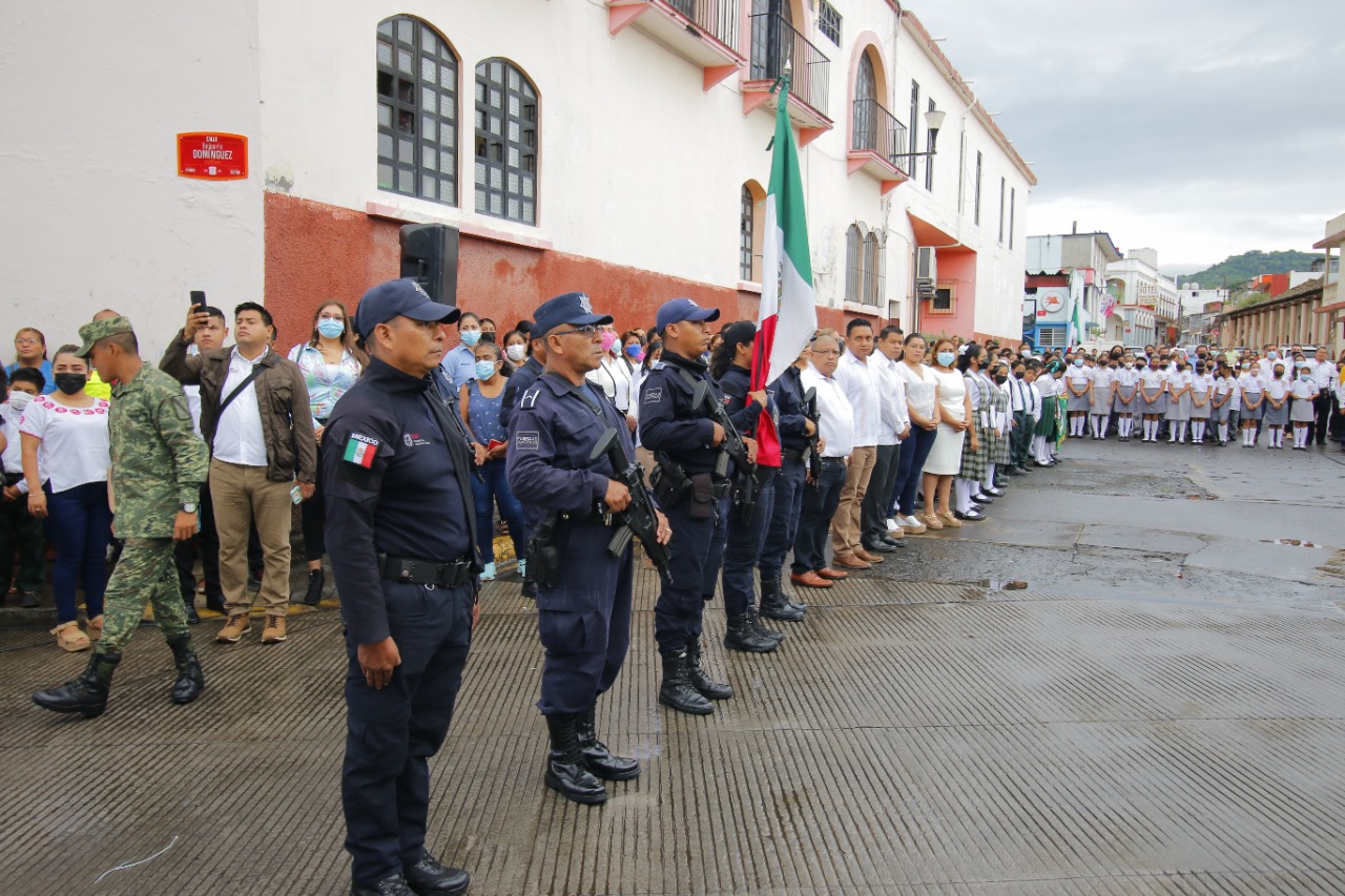 Elementos de la policía municipal a cargo de Maurice Hernández Xala, fueron los encargados de portar la bandera durante el acto cívico al que acudieron escuelas primarias de la zona urbana, de las cuales participaron las alumnas del 4to. grado grupo B, de la escuela Niños Héroes de Chapultepec, Valeria Selene Torres David y Zoe Alanis Azcanio Rodríguez.