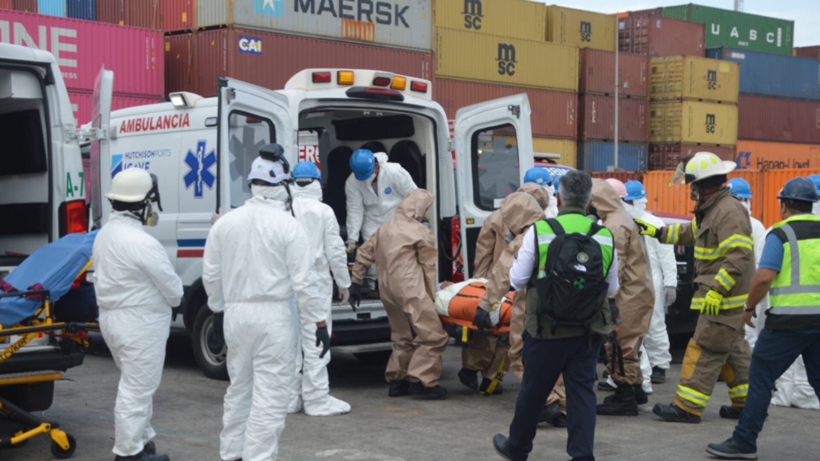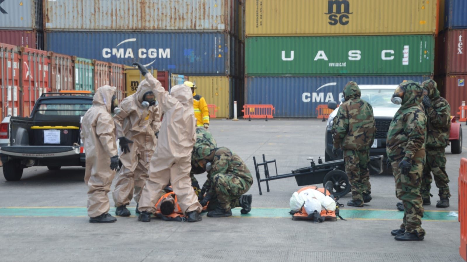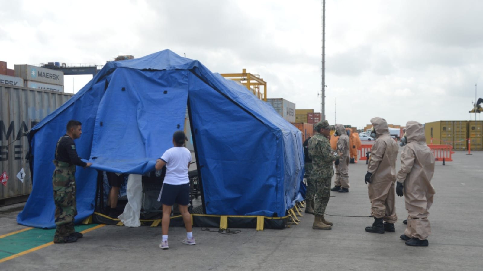 Posteriormente, se identificó como amoniaco de alta concentración el agente simulado, procediendo a aislar la denominada “zona caliente” para su neutralización y control, restableciendo finalmente el Nivel I de protección del puerto.