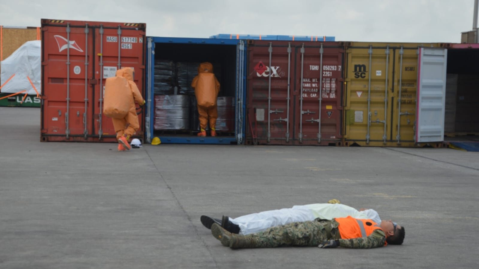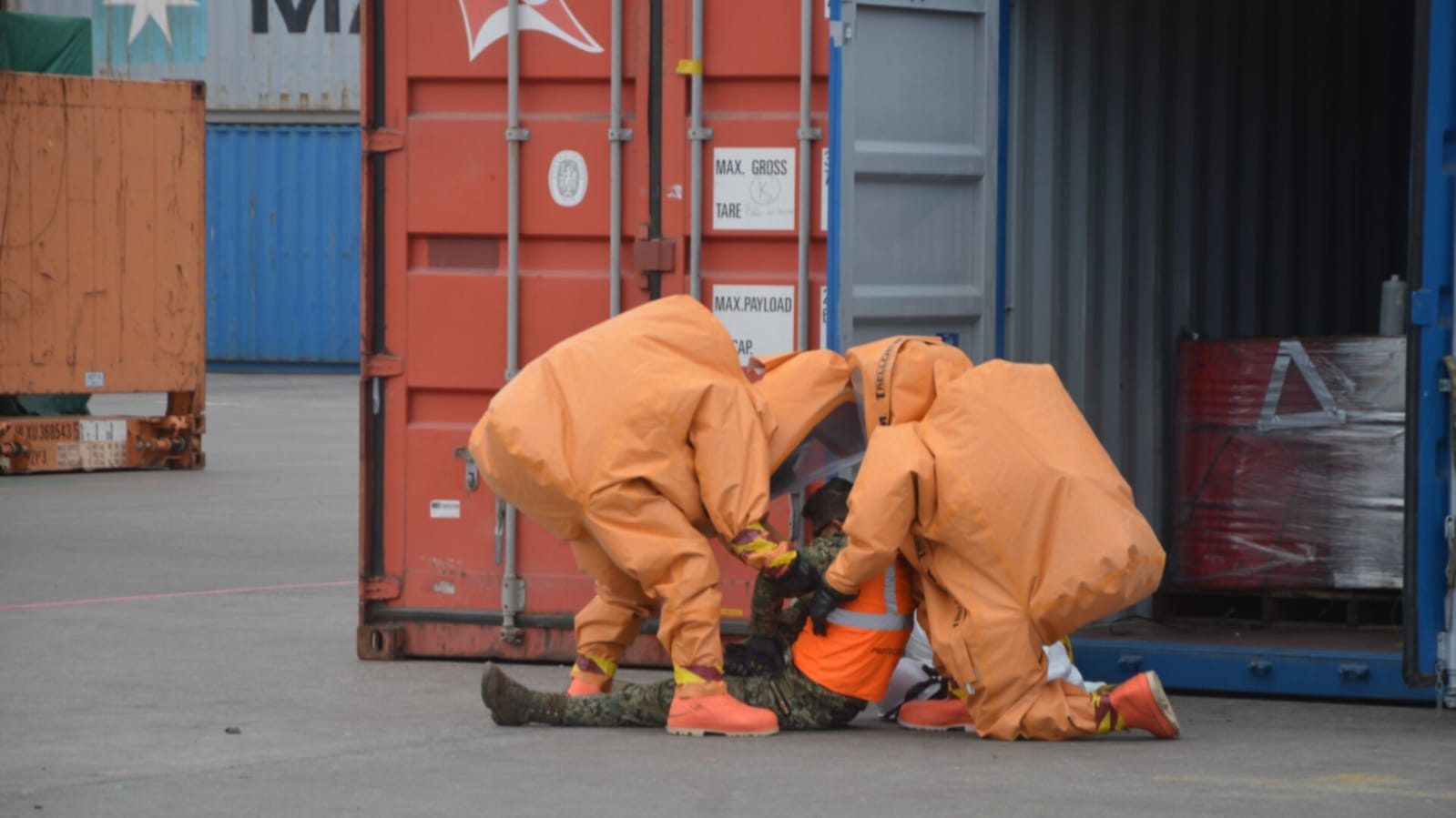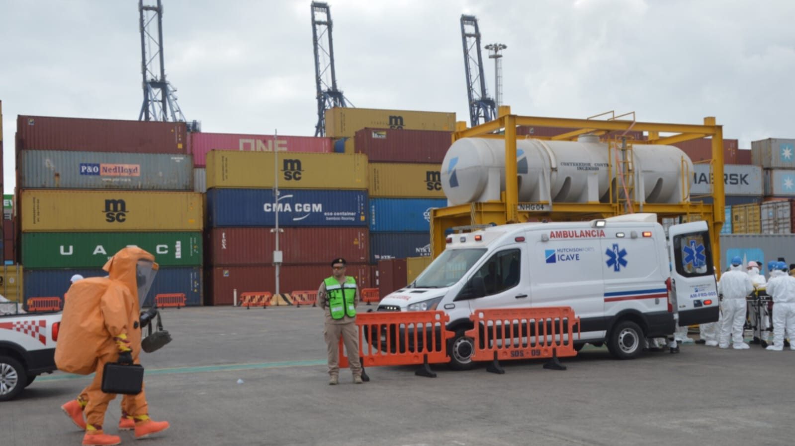 Posteriormente, se identificó como amoniaco de alta concentración el agente simulado, procediendo a aislar la denominada “zona caliente” para su neutralización y control, restableciendo finalmente el Nivel I de protección del puerto.