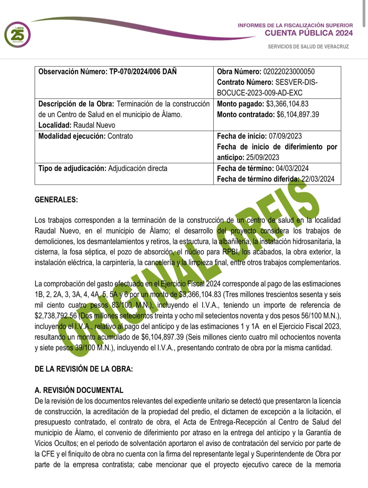 -Ixhuatlán de Madero: Hubo observaciones por incumplimiento de contrato en la construcción de un centro de salud en el municipio de Ixhuatlán de Madero. El monto pagado fue de $3,456,359.69, pero el monto contratado fue de $6,102,301.70.