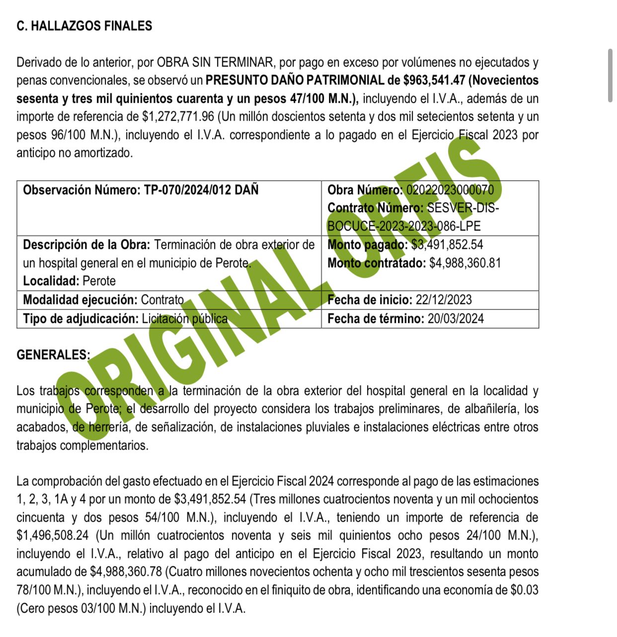 -Hospital de Perote: En la terminación de obra exterior del hospital de Perote, el monto pagado fue de $3,491,852.54. La obra se encuentra terminada, pero se identificó una economía de $0.03.