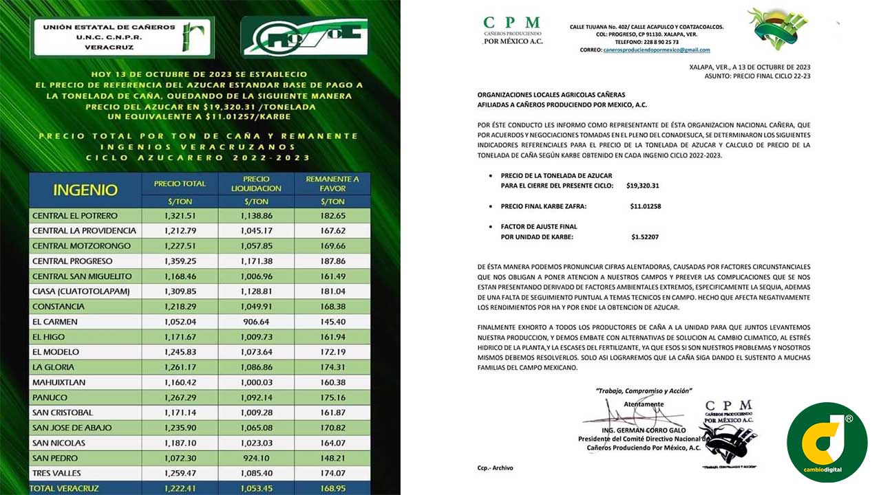 Al caso, mientras que para el ciclo de zafra 2022-2023 el precio de la tonelada de azúcar se fijó en 19 mil 320.21 pesos por el Comité de Desarrollo Sustentable de la Caña de Azúcar (Conadesuca), dicho organismo fijó también un precio de la tonelada del endulzante de 17 mil 500 pesos para calcular preliquidaciones para la zafra 2023-2024, lo que resulta en mil 69.51 pesos para el ingenio Adolfo López Mateos, mil 140.80 pesos para el Tres Valles, y mil 60.85 pesos para el San Cristóbal.