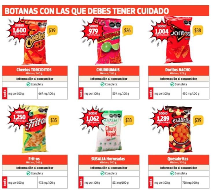 Debido al riesgo que representa, la Profeco se dio a la tarea de analizar los niveles de sodio en una serie de productos, entre los cuales se encuentran las botanas.