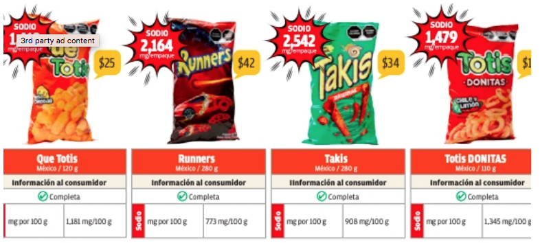 El producto que presentó el mayor contenido de sodio fueron los Takis originales, los cuales contienen 2 mil 542 miligramos de sodio. A este le siguieron los Runners, con 2 mil 164 miligramos; los Cheetos Torciditos con mil 600; los Totis Donitas con mil 479; Que Totis con mil 418; Quesabritas con mil 289.