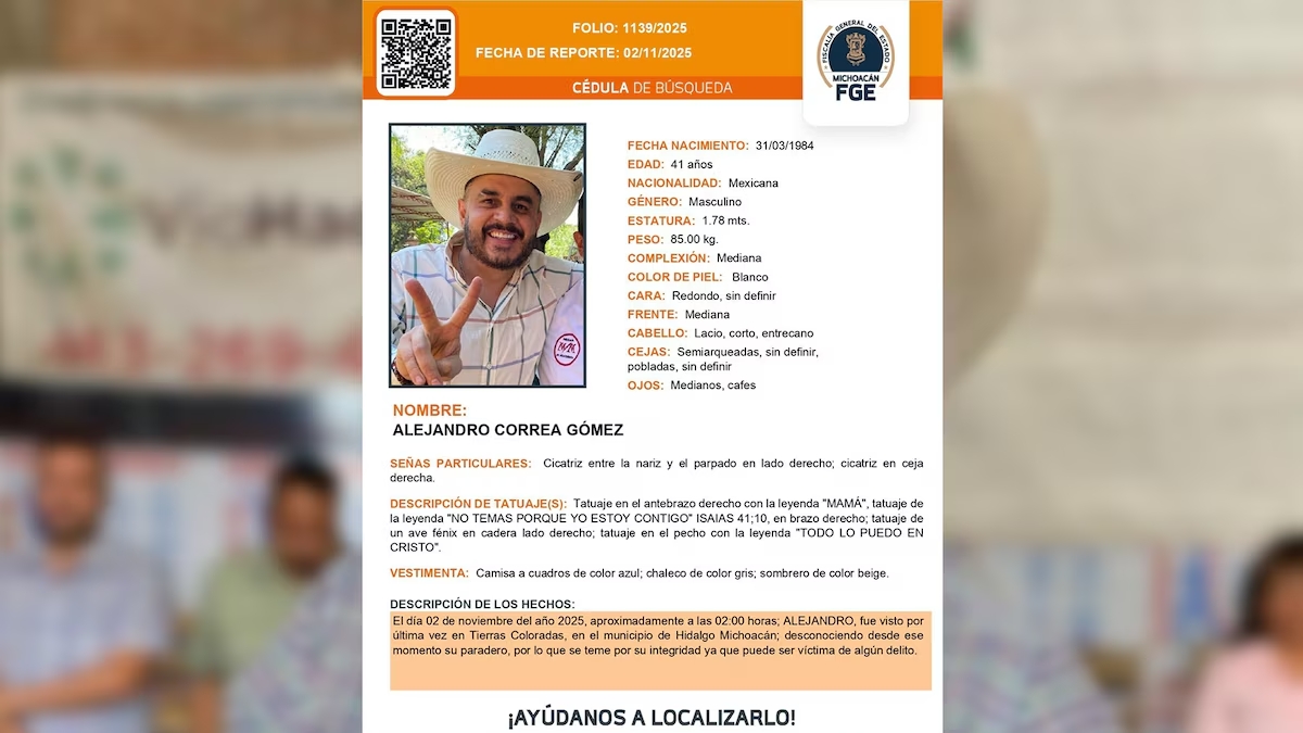 De acuerdo con la ficha de búsqueda emitida por la Fiscalía General de Michoacán, Alejandro Correa Gómez, de 41 años, llevaba una camisa a cuadros de color azul, chaleco color gris y un sombrero beige previo a su desaparición.
