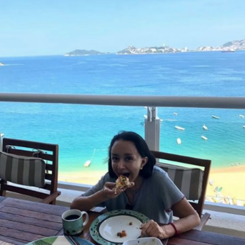 Abajo de una imagen donde se le ve a la actriz de telenovelas como Sueños y caramelos y Dame chocolate disfrutando de un desayuno y con el mar de la bahía del estado de Guerrero de fondo, María Antonieta escribió: