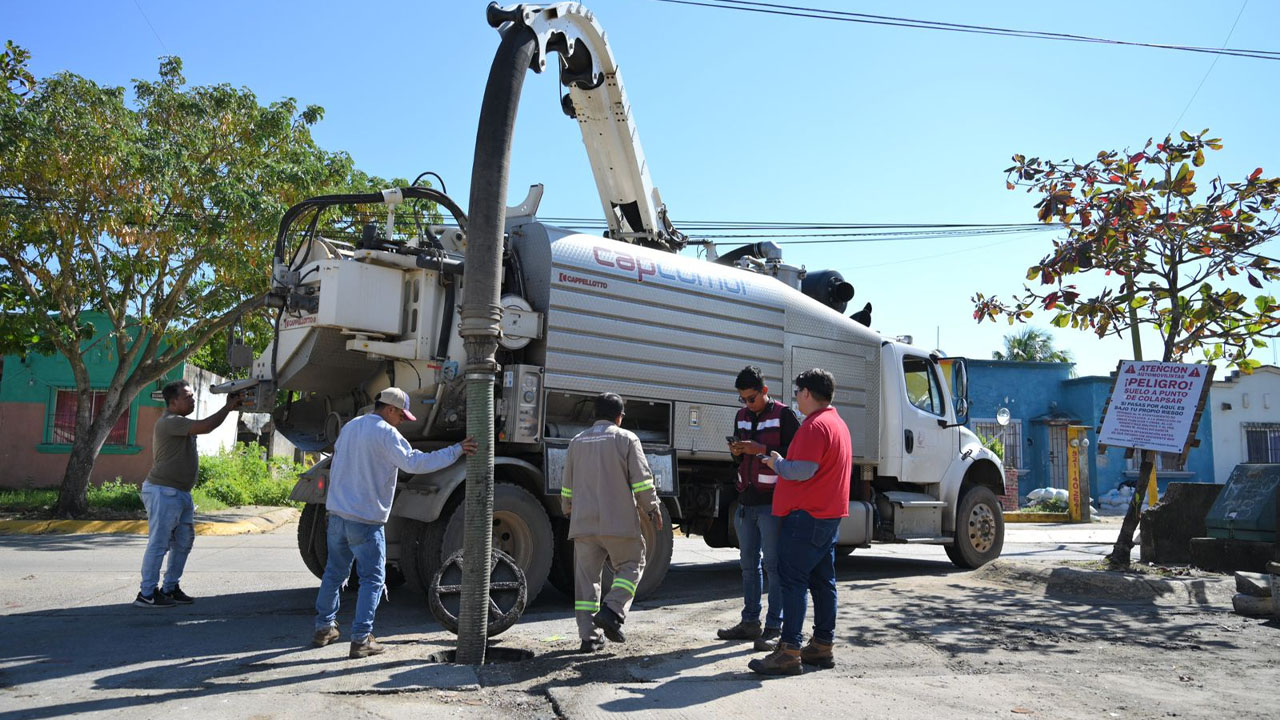 Con el apoyo del vactor perteneciente a Obras Públicas, también se realizan trabajos de desazolve en descargas domiciliarias y vialidades, con el objetivo de eliminar aguas residuales acumuladas en distintos puntos del fraccionamiento.