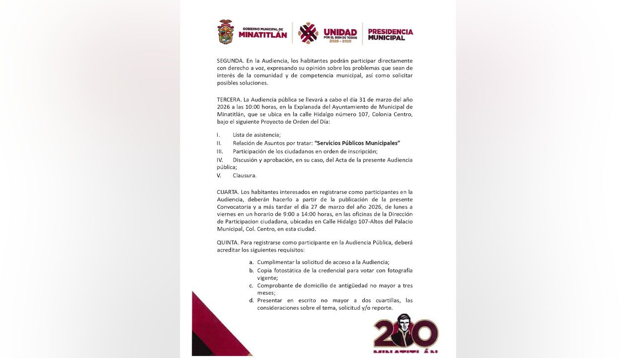 Minatitlán, Ver.- El Gobierno de Minatitlán, encabezado por el presidente municipal Guillermo Reyes Espronceda, lanzó la convocatoria para participar en la Primera Audiencia Pública, un ejercicio enfocado en fortalecer la comunicación directa con la población.