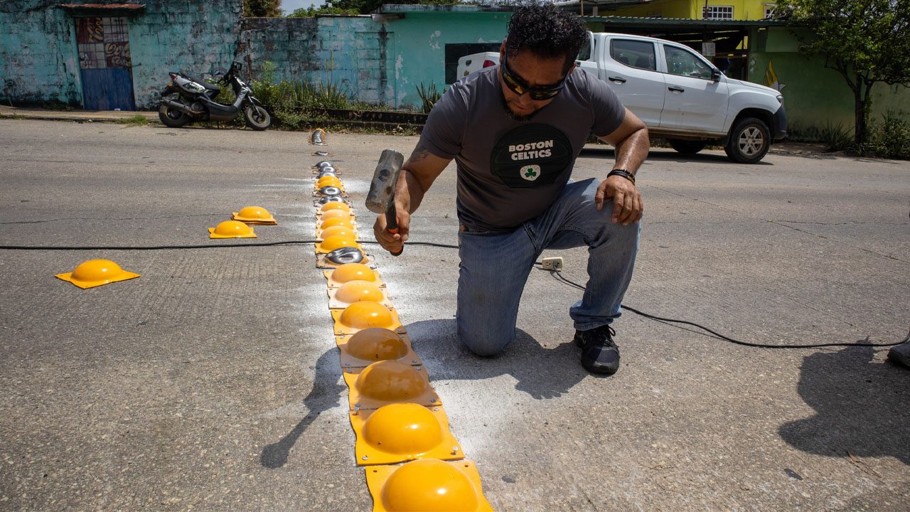 Minatitlán refuerza la seguridad vial con instalación de boyas metálicas