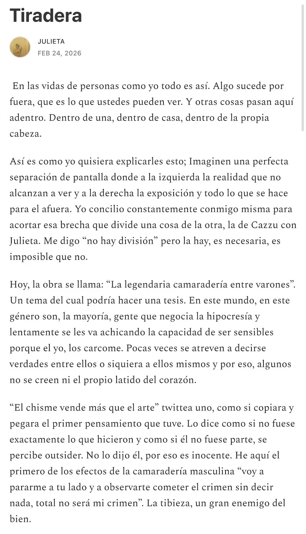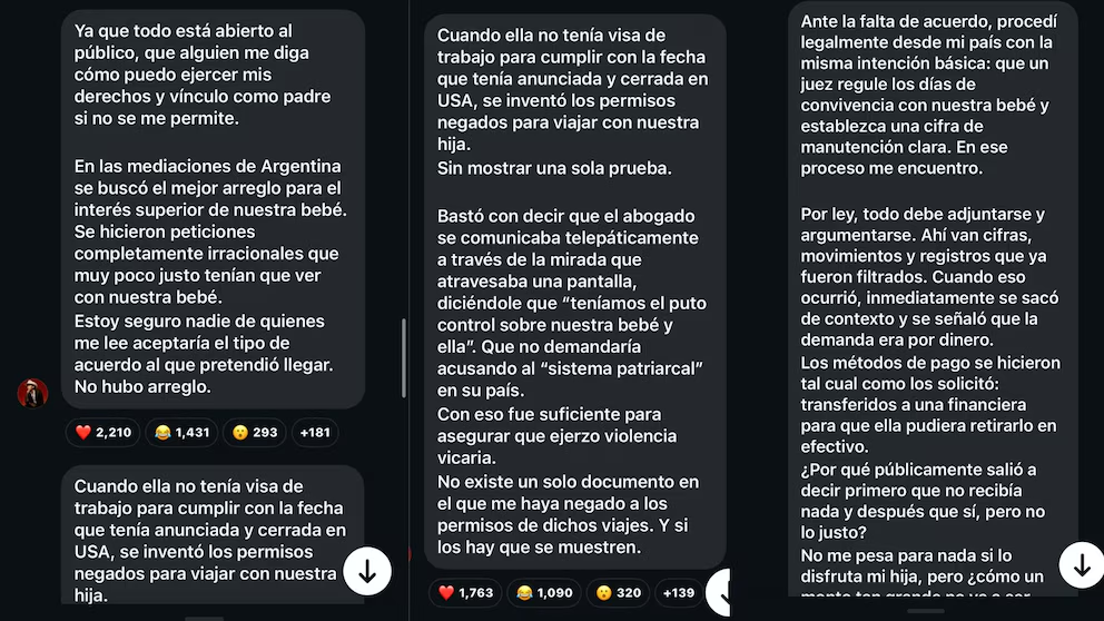 DJ Mami intervino a favor de Cazzu a través de Instagram, calificando a Nodal de “miserable” e insinuando que sus mensajes fueron generados por inteligencia artificial, al tiempo que lo instó a interesarse genuinamente por su hija: “El tiempo que invertiste en subir un mensaje generado por Chat gpt para volver a exhibirte como el miserable que sos, podrías dedicarlo a algo infinitamente más valioso y noble como llamar a tu hija, preguntar cómo está, interesarte genuinamente por su mundo. Ah, y el tiempo pasa, y muy rápido. Ya no es una bebé. Es una niña maravillosa y única”.