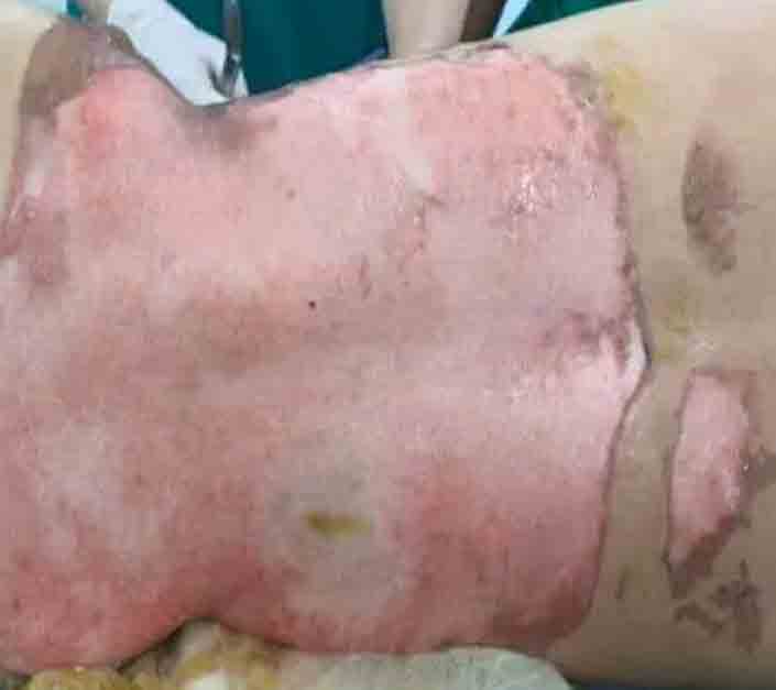 Game dijo que sufrió quemaduras de tercer grado y dolorosas ampollas que le cubrieron la mayor parte de la espalda y debajo de los pechos y que lleva meses recibiendo tratamiento para combatirlas.