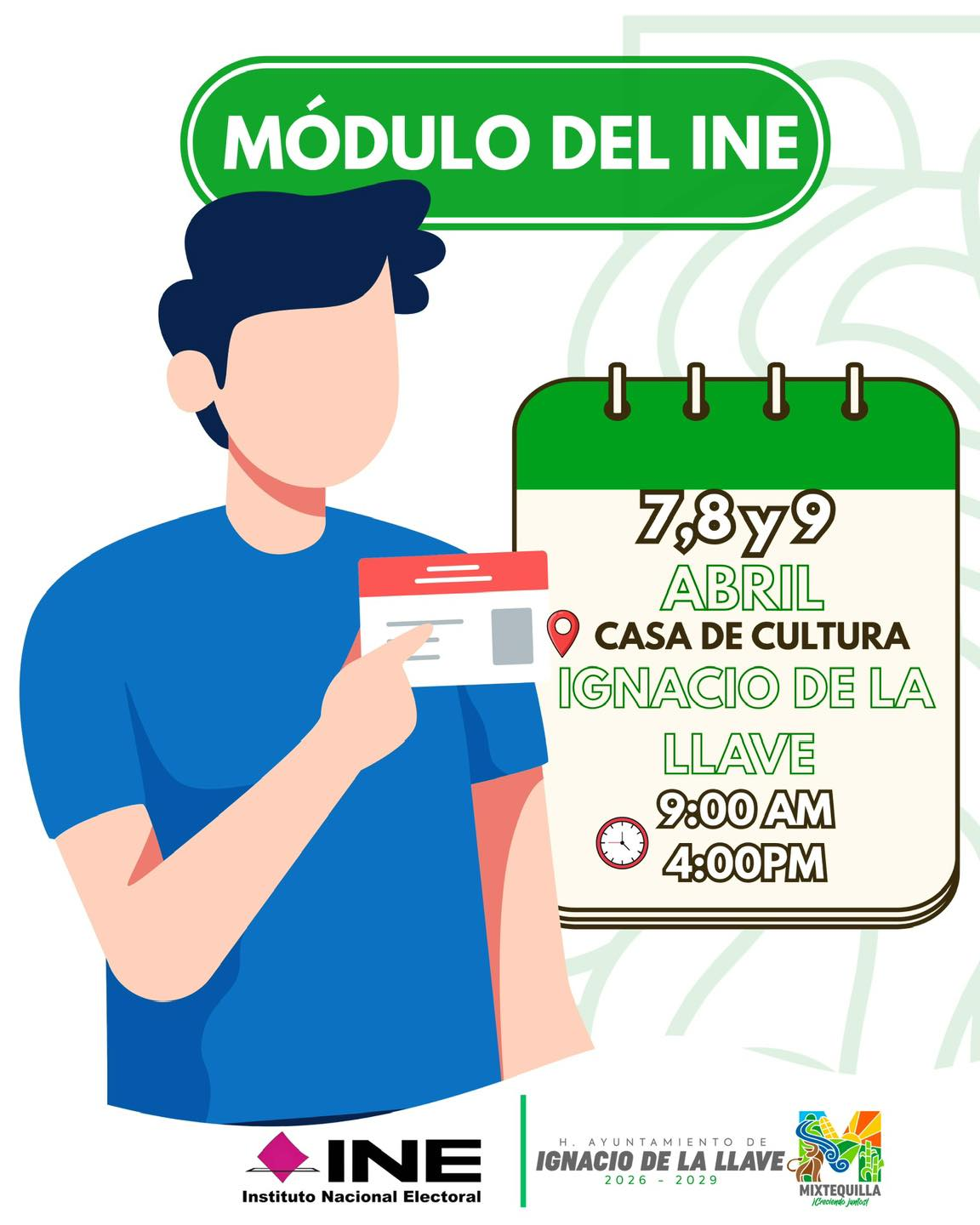 Ignacio de la Llave, Ver.- El módulo del INE estará brindando atención a la ciudadanía de Ignacio de la Llave los días 7, 8 y 9 de abril para trámites de credencialización, actualización y reposición de la credencial para votar. Acude y mantén tu documentación en regla.