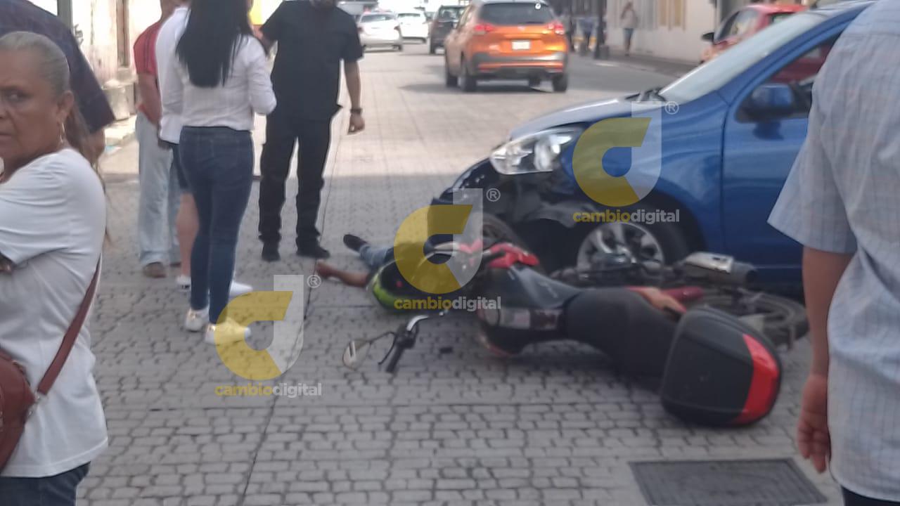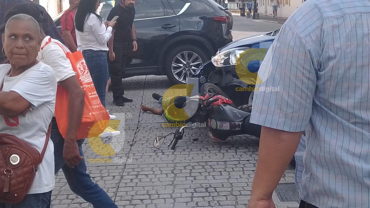 Veracruz, Ver.- Este lunes se registró un accidente entre un automóvil particular y un motociclista en la esquina de Arista y Landero y Coss en el centro histórico del puerto de Veracruz.