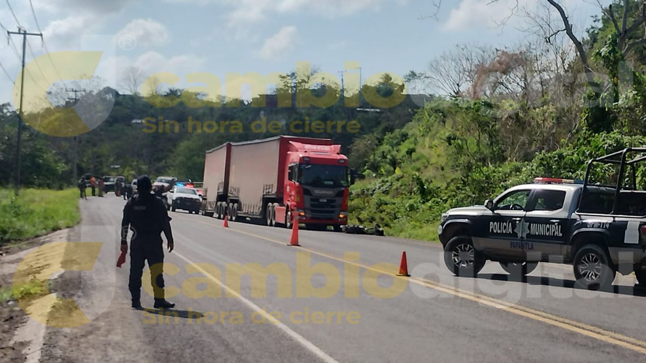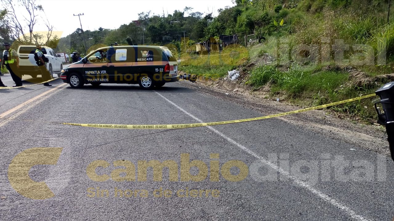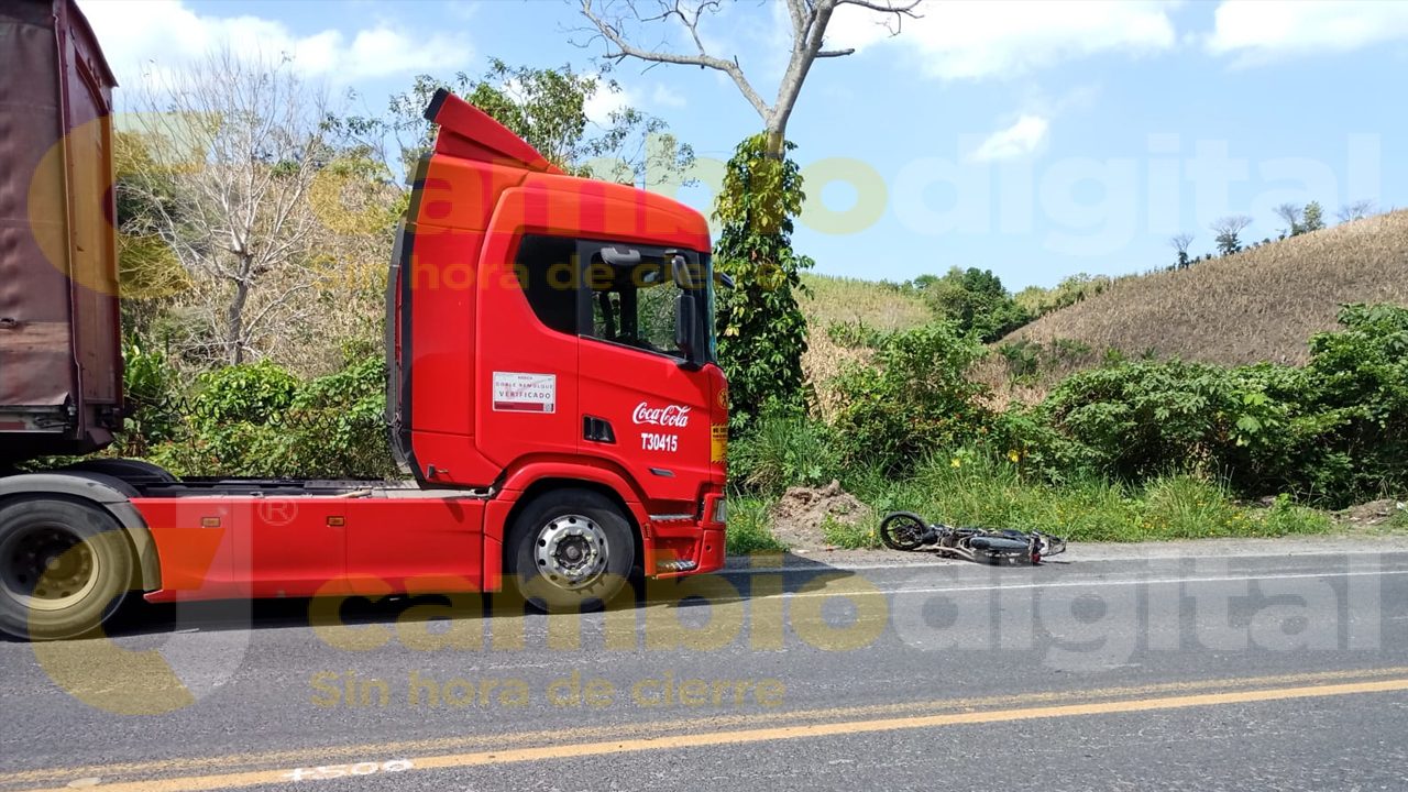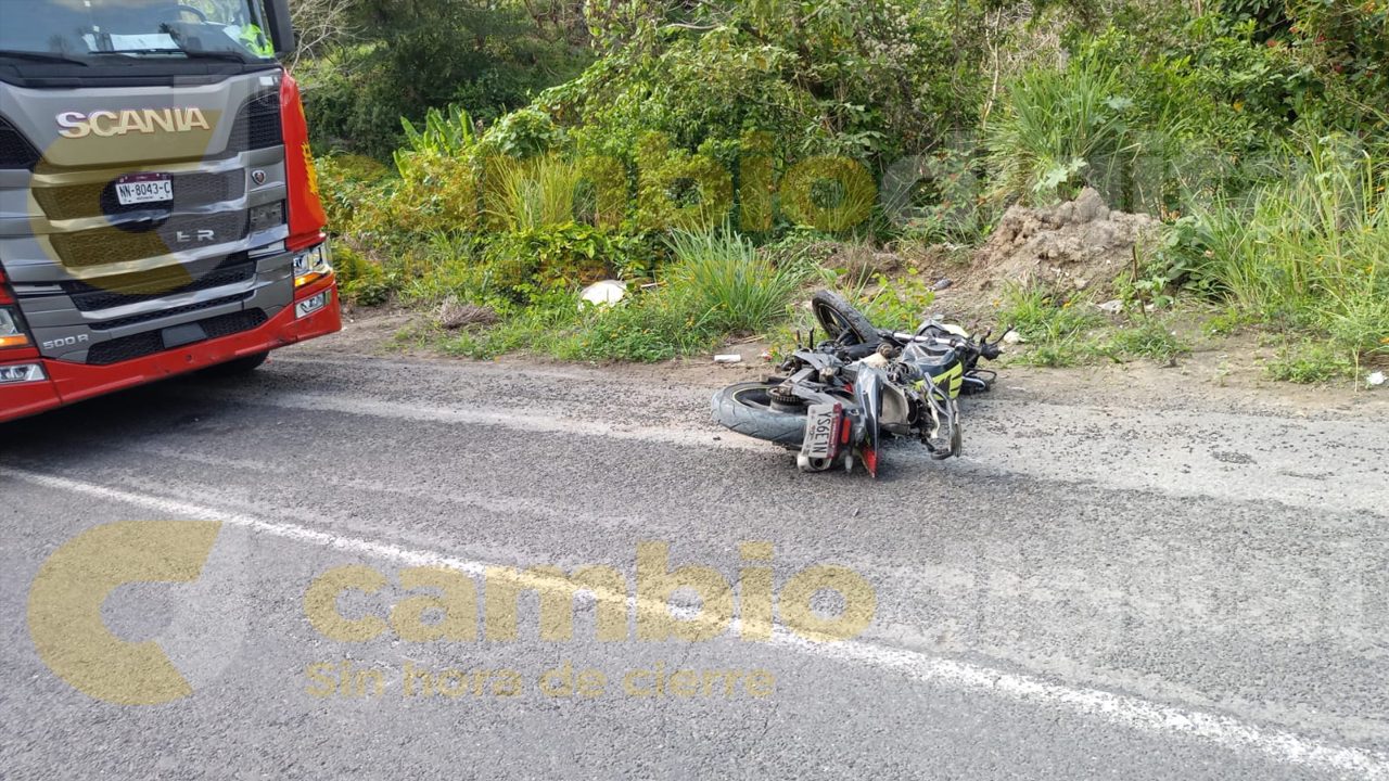 Papantla, Ver.- Un trágico accidente ocurrió en la carretera federal 2080 Poza Rica-Cardel, en el tramo del libramiento de esta ciudad, donde el conductor de una motocicleta perdió la vida tras impactarse contra un tráiler de doble remolque, el cual transportaba rejas con envases para refresco.