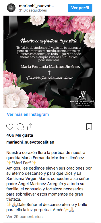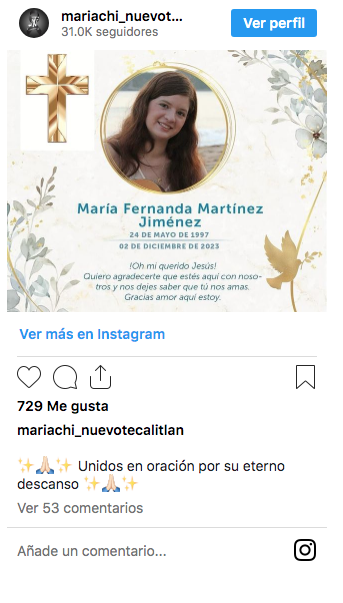 El Mariachi Nuevo Tecalitlán también pidió oraciones por el descanso de María Fernanda Martínez al compartir una foto de la joven en el que se aprecia su fecha de nacimiento y el día que murió.
