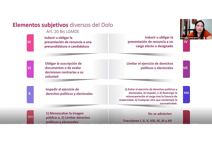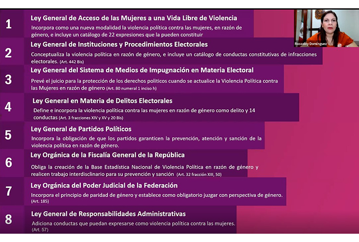 Rosselvy del Carmen Domínguez recordó que las reformas en materia de violencia política fueron aprobadas por unanimidad por la Cámara de Senadores y su publicación en el Diario Oficial de la Federación el 13 de abril de 2020 permitió se hicieran modificaciones a otras ocho normas jurídicas, entre ellas las leyes de Acceso de las Mujeres a una Vida Libre de Violencia; generales de Instituciones y Procedimientos Electorales, del Sistema de Medios de Impugnación en Materia Electoral, en Materia de Delitos Electorales, de Partidos Políticos, y de Responsabilidades Administrativas, así como las leyes orgánicas de la Fiscalía General de la República, y del Poder Judicial de la Federación.