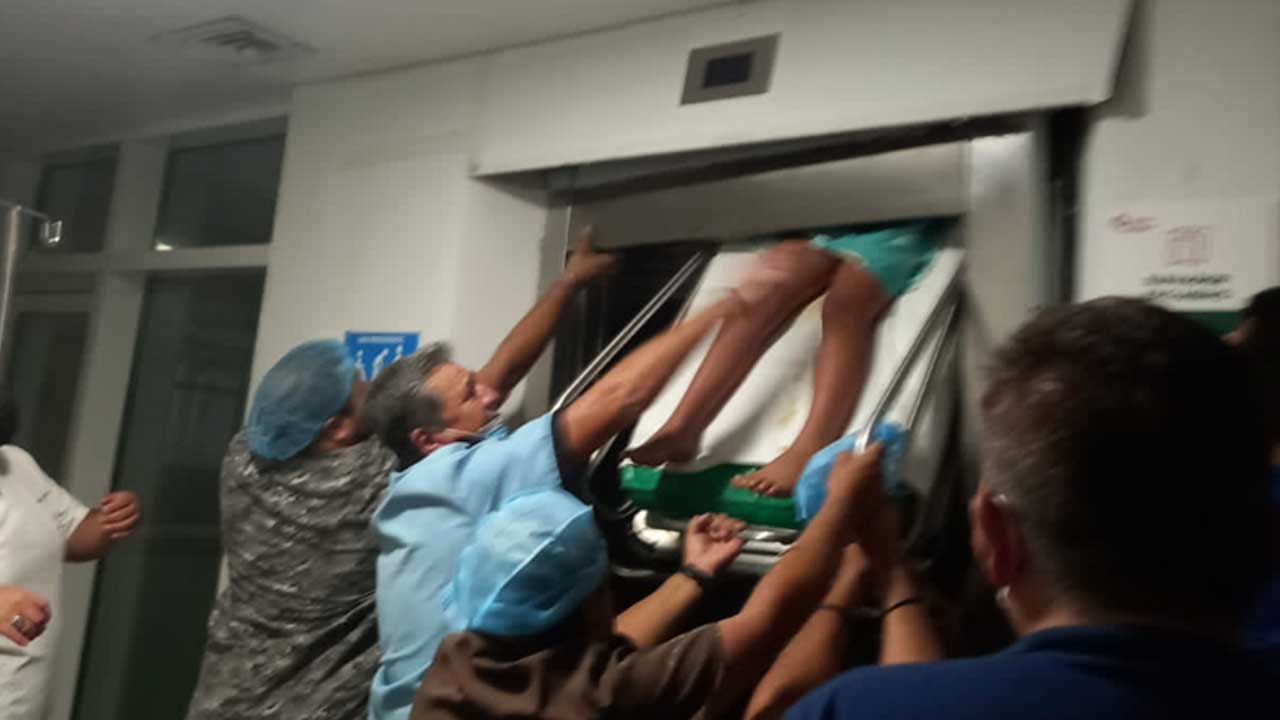 En imágenes que se difundieron en redes sociales se ve la camilla en la parte de arriba de la puerta del elevador, prensada a la mitad.