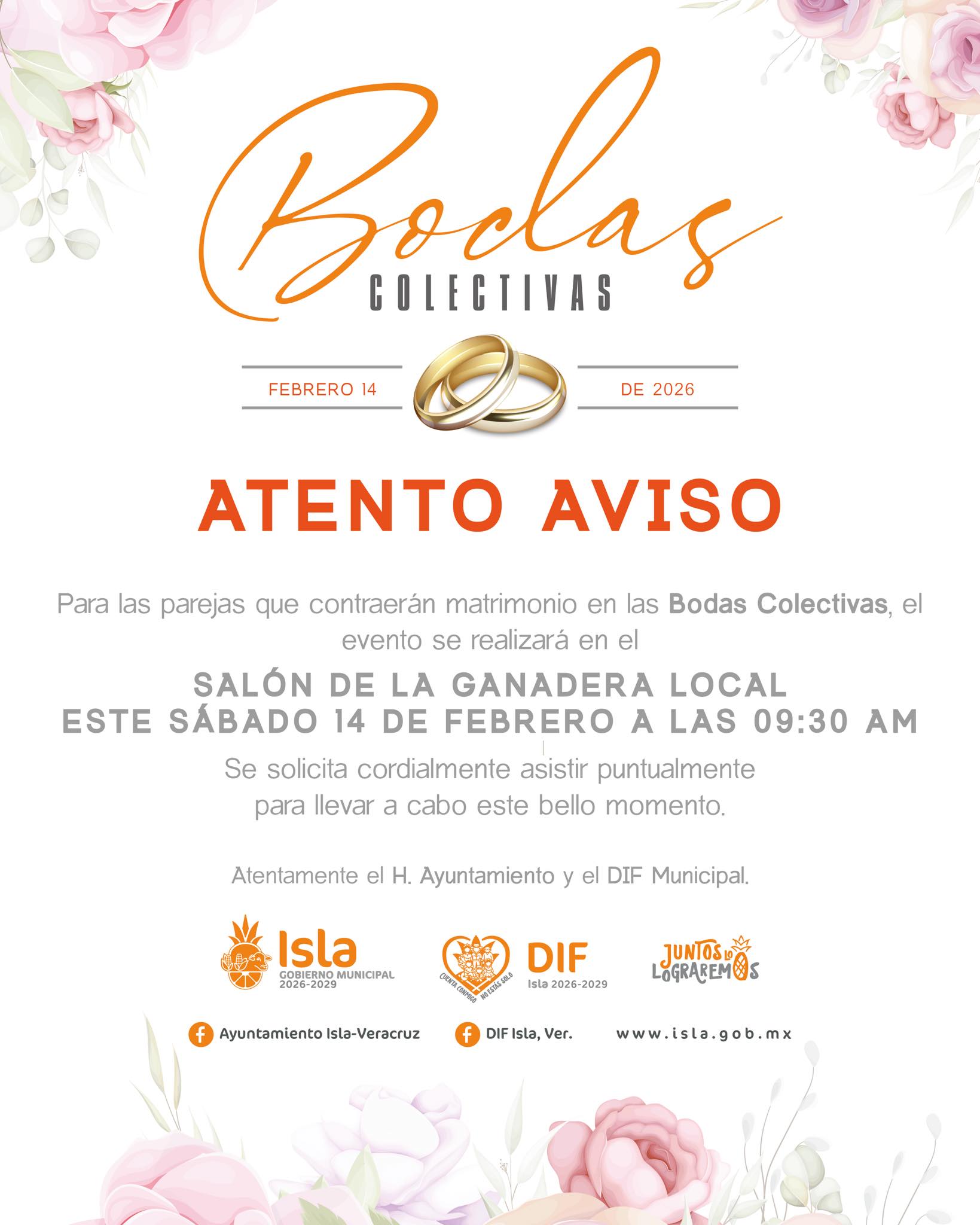 Isla, Ver.- A las parejas que contraerán matrimonio en las Bodas Colectivas 2026 en Isla, les informamos que el evento se llevará a cabo este sábado 14 de febrero, en el Salón de la Ganadera Local, a las 09:30 de la mañana.