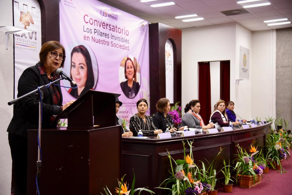 Xalapa, Ver.- En su participación durante el conversatorio Pilares invisibles de nuestra sociedad, la presidenta de la Mesa Directiva de la LXVI Legislatura del estado de Veracruz, diputada Margarita Corro Mendoza, enfatizó que no debe retrocederse ni un centímetro en la exigencia de tratar a las mujeres con dignidad y respeto, así como en la defensa de los lugares que han logrado en los últimos años.