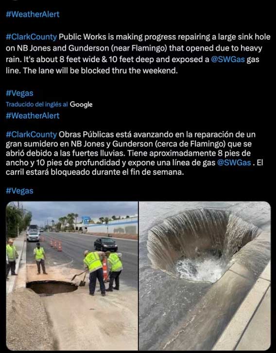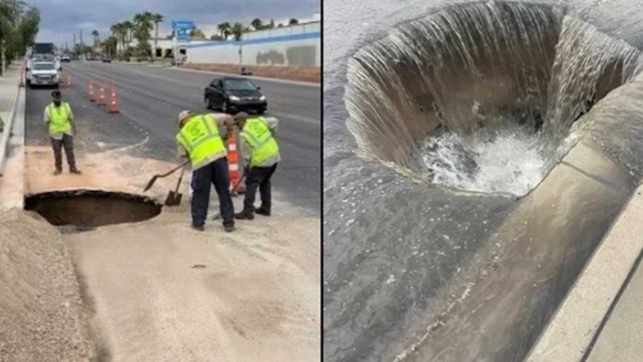 Estados Unidos.- El mal clima ya causó estragos en las calles de Las Vegas, pues se abrió un socavón como los que vemos a menudo en México.