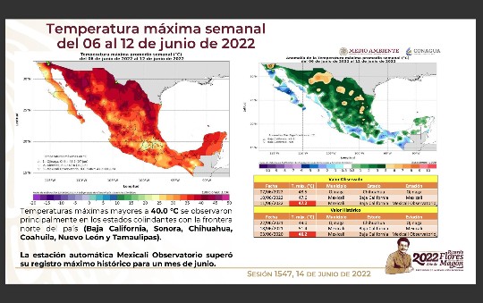 Sobre las temperaturas máximas, se puntualizó que las superiores a 40 grados Celsius se registraron principalmente en los estados colindantes con la frontera norte de México: Baja California, Chihuahua, Coahuila, Nuevo León, Sonora y Tamaulipas. El récord se superó en Mexicali, Baja California, donde el termómetro marcó hasta 47.2 grados Celsius.